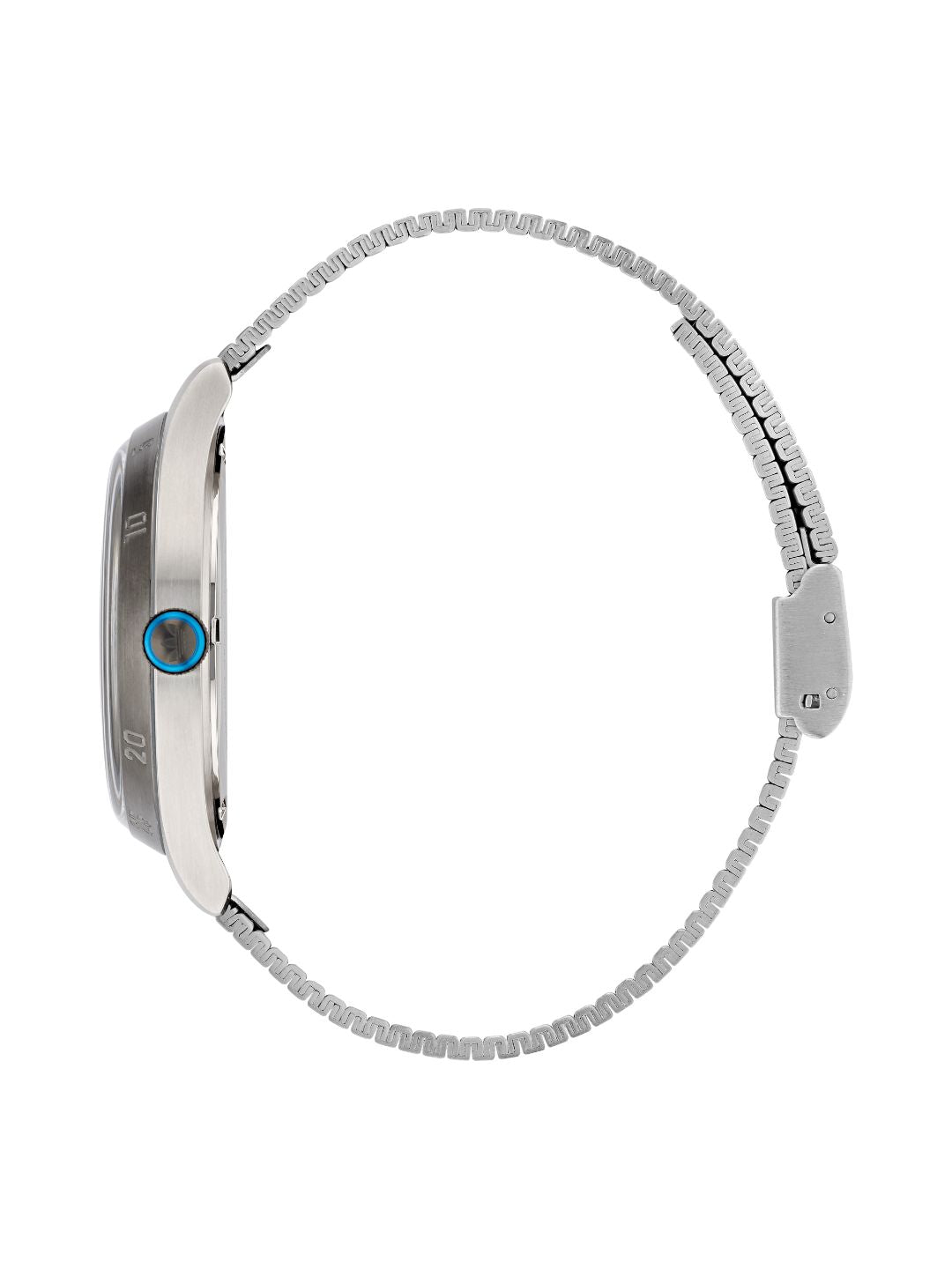 - SST Silver/Gunmetal tone case with blue accents, black dial, silver bclt