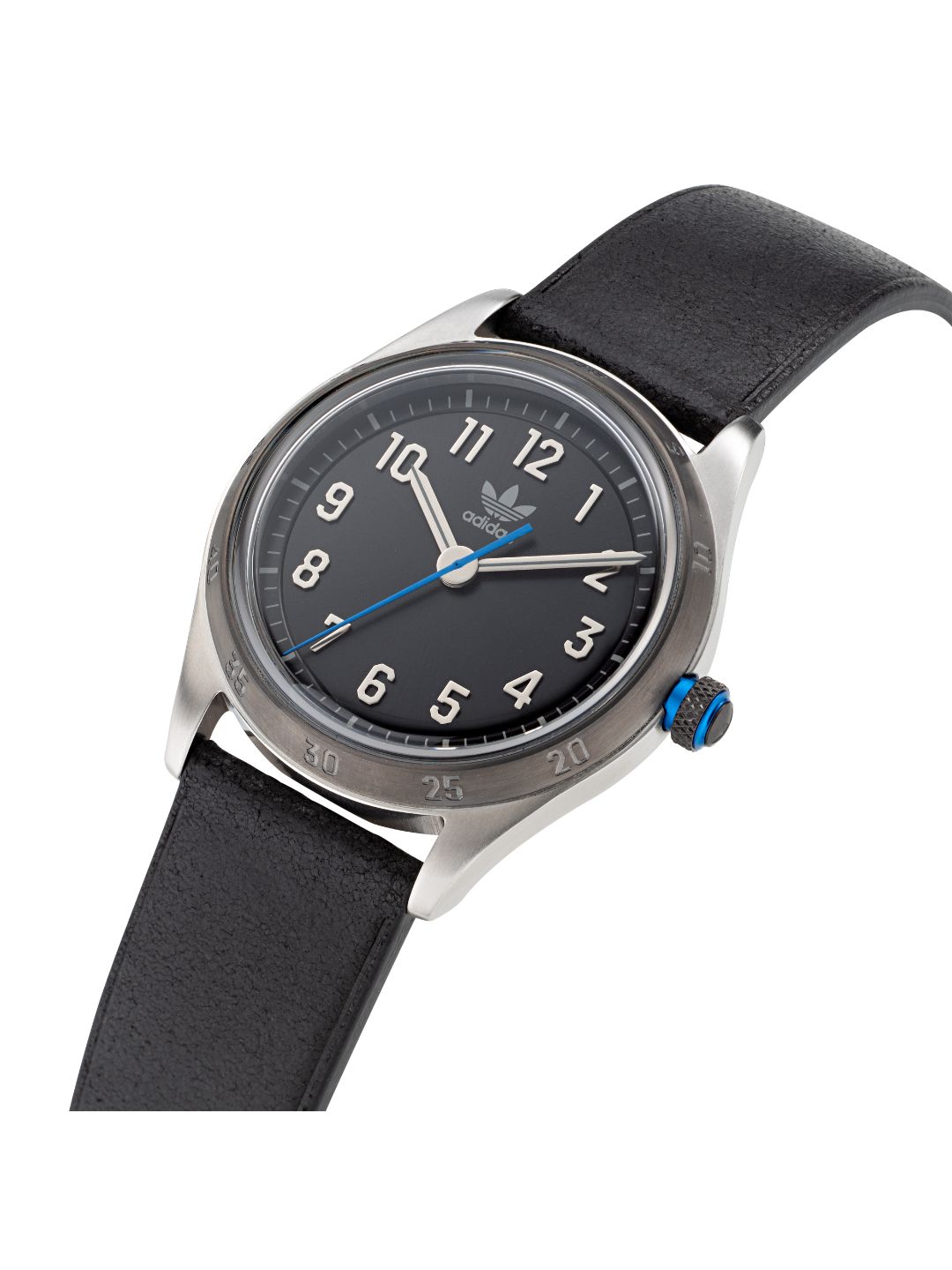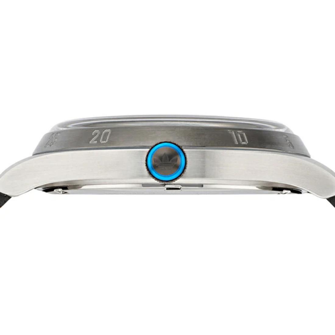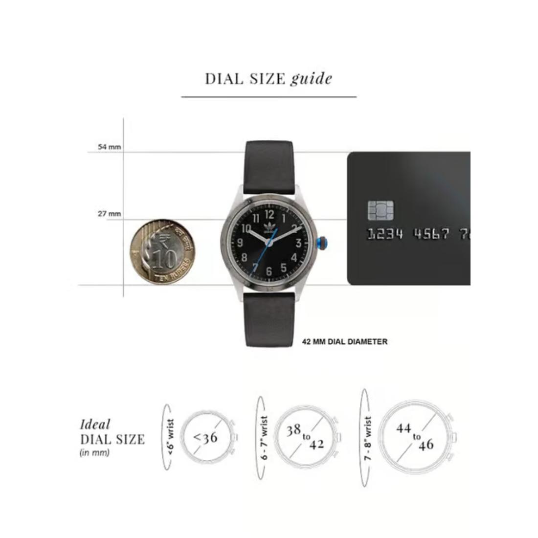 This Adidas watch, expertly built with a sleek black dial with Originals Blue accents, is both fashionable and practical. The SST Silver/Gunmetal tone case and black eco-leather strap are both durable and comfortable, while the 50 M water resistance and quartz mechanism provide accuracy and reliability. This watch is ideal for casual events, comes with a one-year warranty.?á To keep it looking its best, use a cotton cloth to clean the dial.