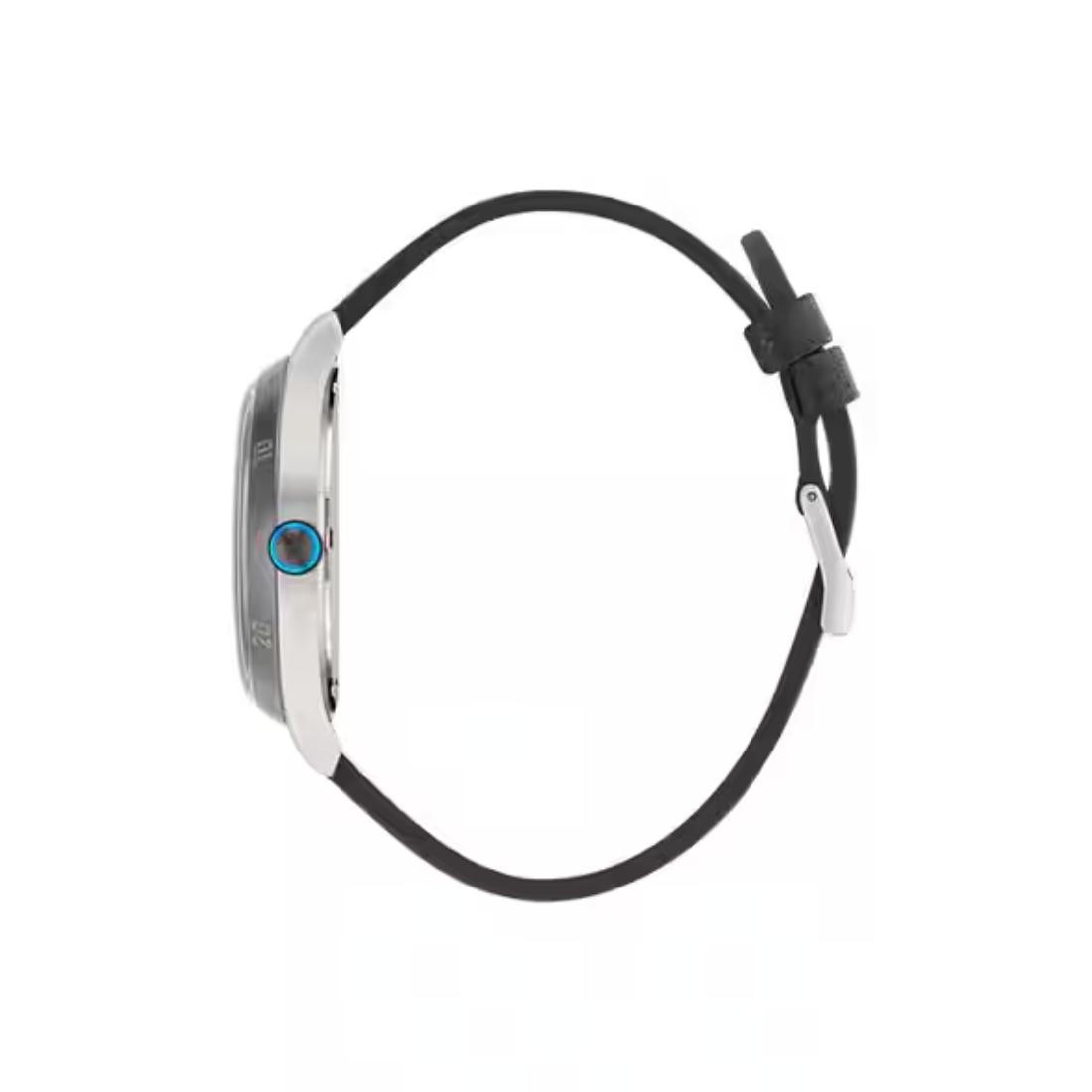 - SST Silver/Gunmetal tone case, black dial, Originals Blue accents, black eco-leather strap