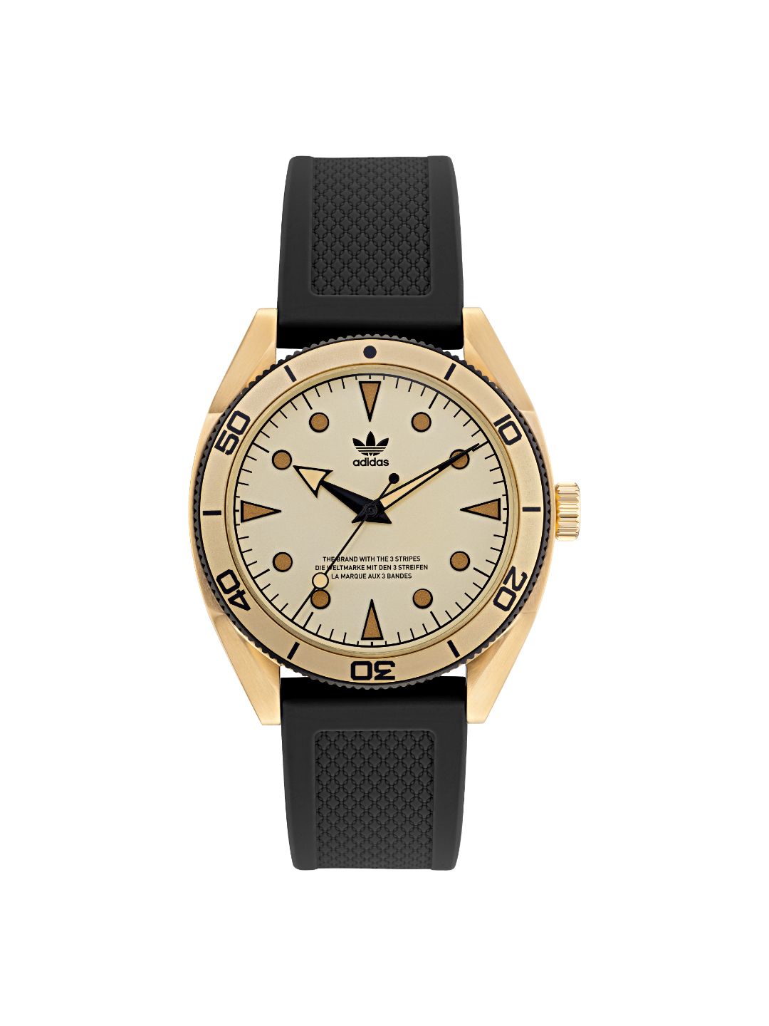 The Adidas Originals Gold Dial Unisex Watch is the ideal combination of function and style. This watch, with a stainless steel gold-tone case and black silicone band, is water resistant up to 100 meters. The analogue display is powered by?áquartz movement and comes with a one-year warranty. Its stylish shape and mineral glass make it a versatile accessory for any casual event. To keep it looking its best, use a cotton cloth to clean the dial.