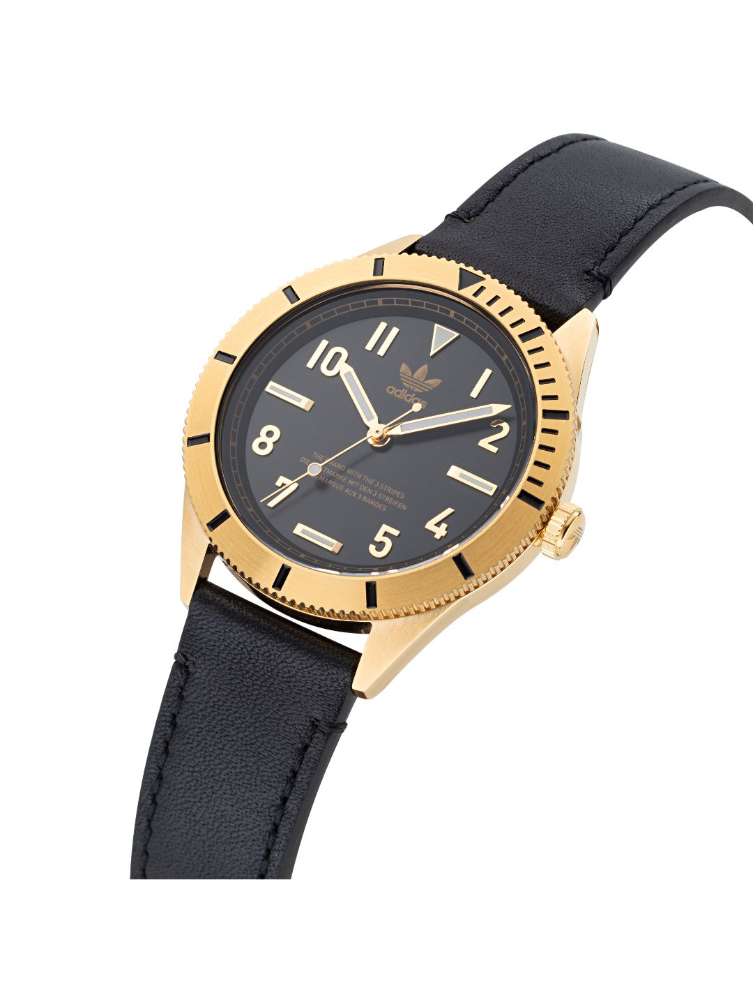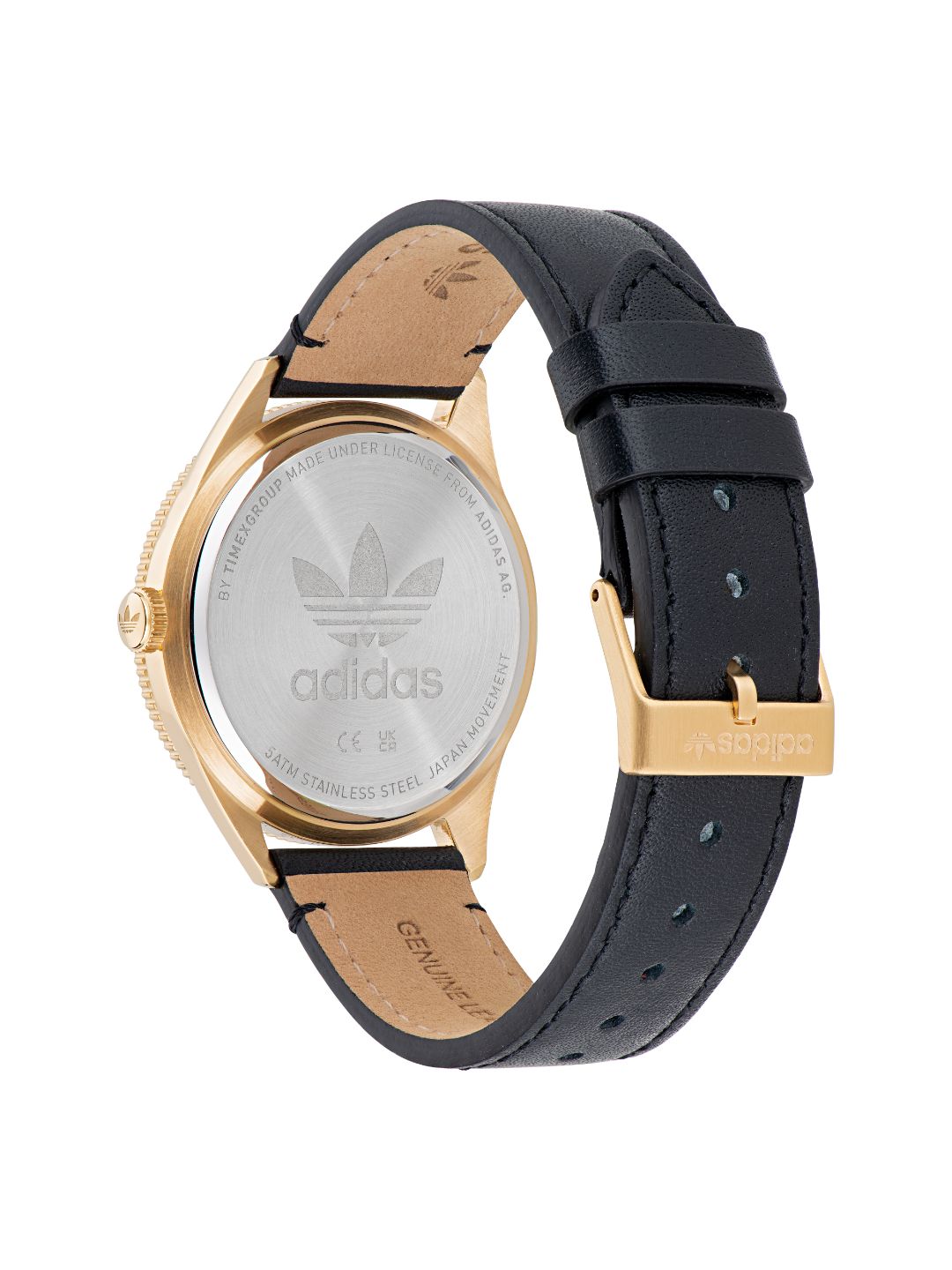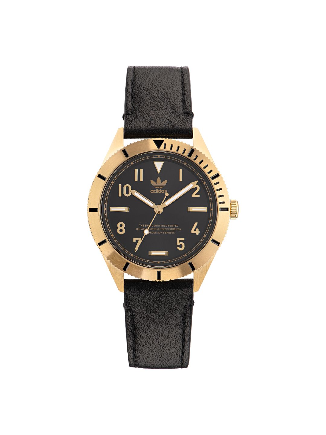 ???The Adidas Originals Gold Dial Unisex Watch is a sleek and attractive wristwatch suitable for casual events. The SST Gold tone case and black dial, with?áthe black eco-leather strap provides both comfort and durability. With a 50-meter water resistance and a one-year warranty, this watch is both useful and reliable. The quartz movement and battery power assure precise timekeeping, while the mineral glass dial provides an added layer of protection. With a 41 mm dial and a 20 mm band width, this watch is appropriate for both men and women. To keep it looking its best, use a cotton cloth to clean the dial.???