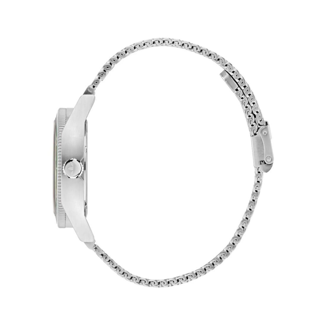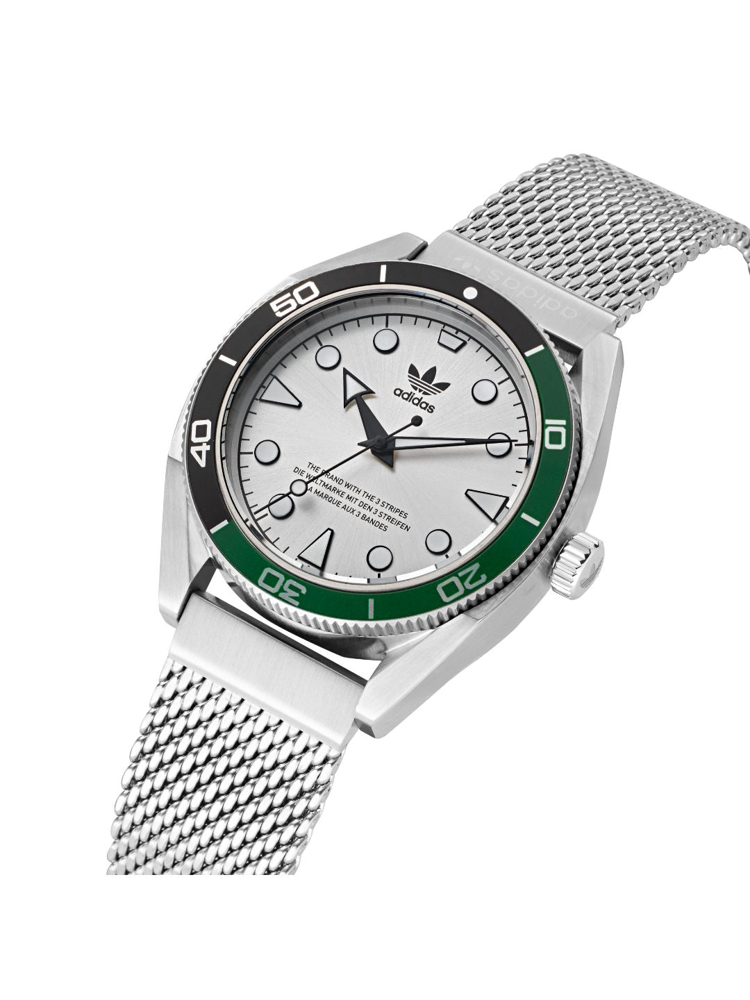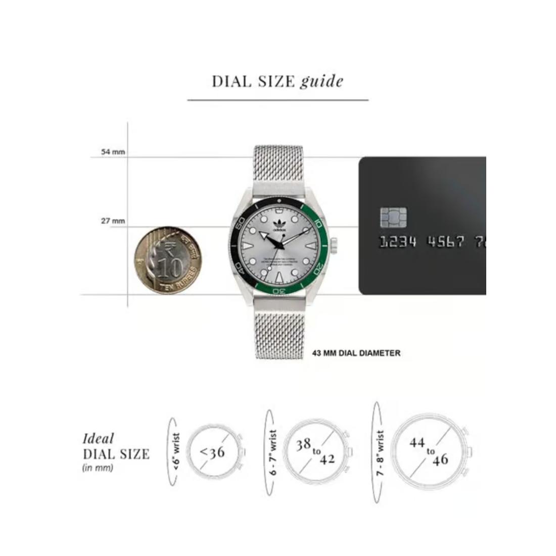 Boost your fashion game with the Adidas Originals Silver Dial Unisex Watch. This watch is both stylish and durable, with to its strong SST silver tone case and mesh band. The black and mineral green top ring offer a splash of color to the sleek silver dial. This watch is water-resistant up to 100 meters and suitable for any casual event. Its quartz movement and battery power and the one-year warranty. This normal analogue watch is the ideal multipack set for any watch aficionado, with a round stainless steel dial and scratch-resistant mineral glass. With a 43 mm display and an 11 mm case thickness, this watch is the ideal combination of utility and style. To keep it looking its best, use a cotton cloth to clean the dial.