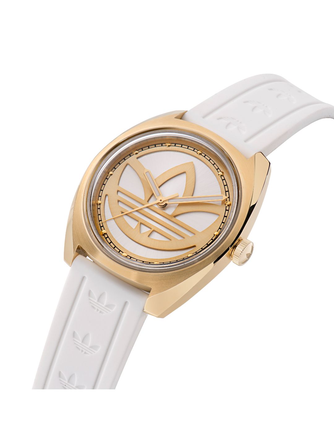 This Adidas Originals watch, expertly designed with a silver-tone dial and white silicone band, is ideal for any casual event. The IP yellow gold SST case?áand gold and silver sunray dial offer an element of luxury to the design. This watch is water-resistant up to 50 meters and comes with a one-year warranty, combining style with durability. To keep it looking its best, use a cotton cloth to clean the dial.