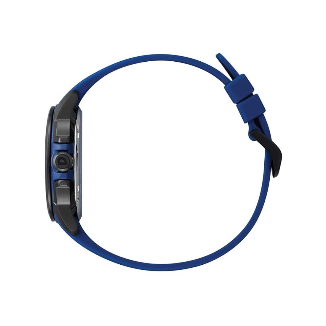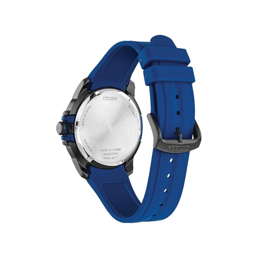 For a more sporty take on a Drive watch from Citizen, this model has a blue, perforated polyurethane strap paired with a black, 45mm stainless-steel case and black dial with subtle blue accents. It is powered by light with Eco-Drive technology and will never need a new battery.