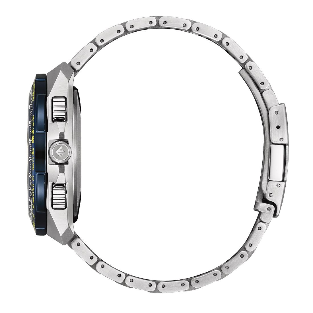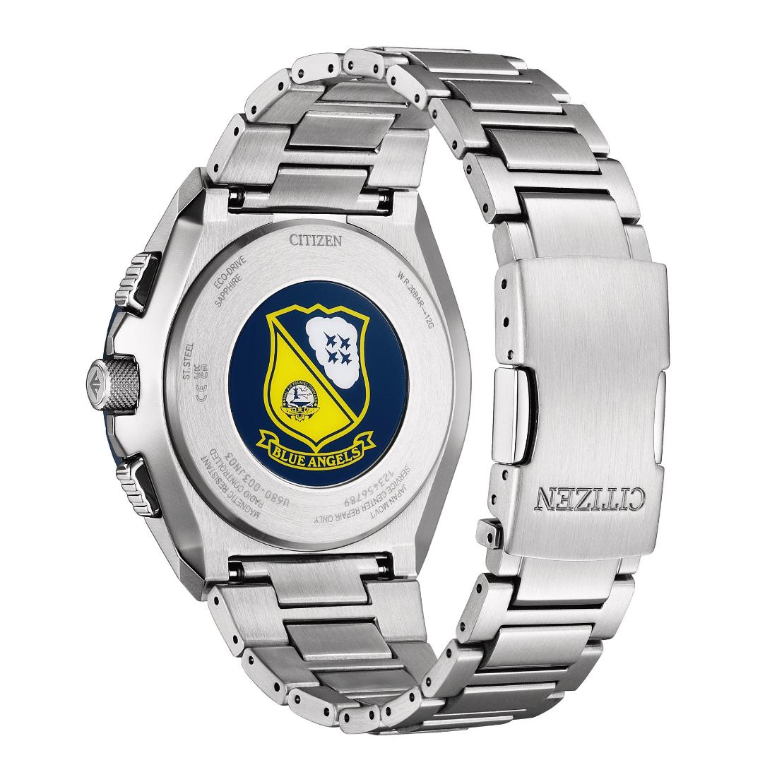The mission of the Blue Angels is to showcase the pride and professionalism of the U.S. Navy and Marine Corps through their expert precision and dedication to excellence and service. This exceptional timepiece has a silver-tone stainless steel case with a blue ion-plated bezel, yellow inner bezel, and blue dial encased in sapphire crystal. It features atomic time clock synchronization for superior accuracy, time adjustment available in 43 world cities, a 1/100 second chronograph that measures up to 24 hours, a perpetual calendar, 2 alarms, 99-minute countdown timer, digital backlight display, Universal Coordinated Time (UTC) display, and a power reserve indicator. The silver-tone stainless steel bracelet band fastens with a fold over clasp with hidden push buttons. The Blue Angel's insignia is replicated on the case back. This distinctive sports watch utilizes our Eco-Drive technology that’s sustainably powered by light and never needs a battery, and is water resistant up to 200 meters. Reach a higher altitude in style and pay tribute to the elite Blue Angels with this high-performance timepiece.