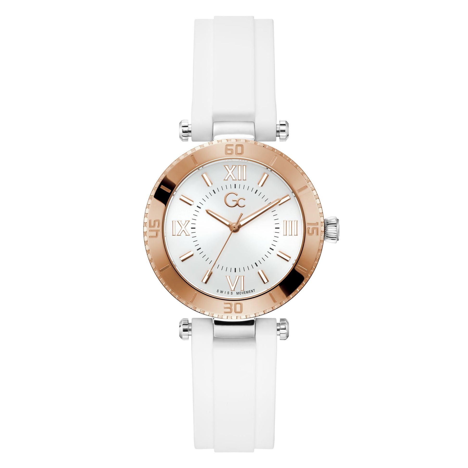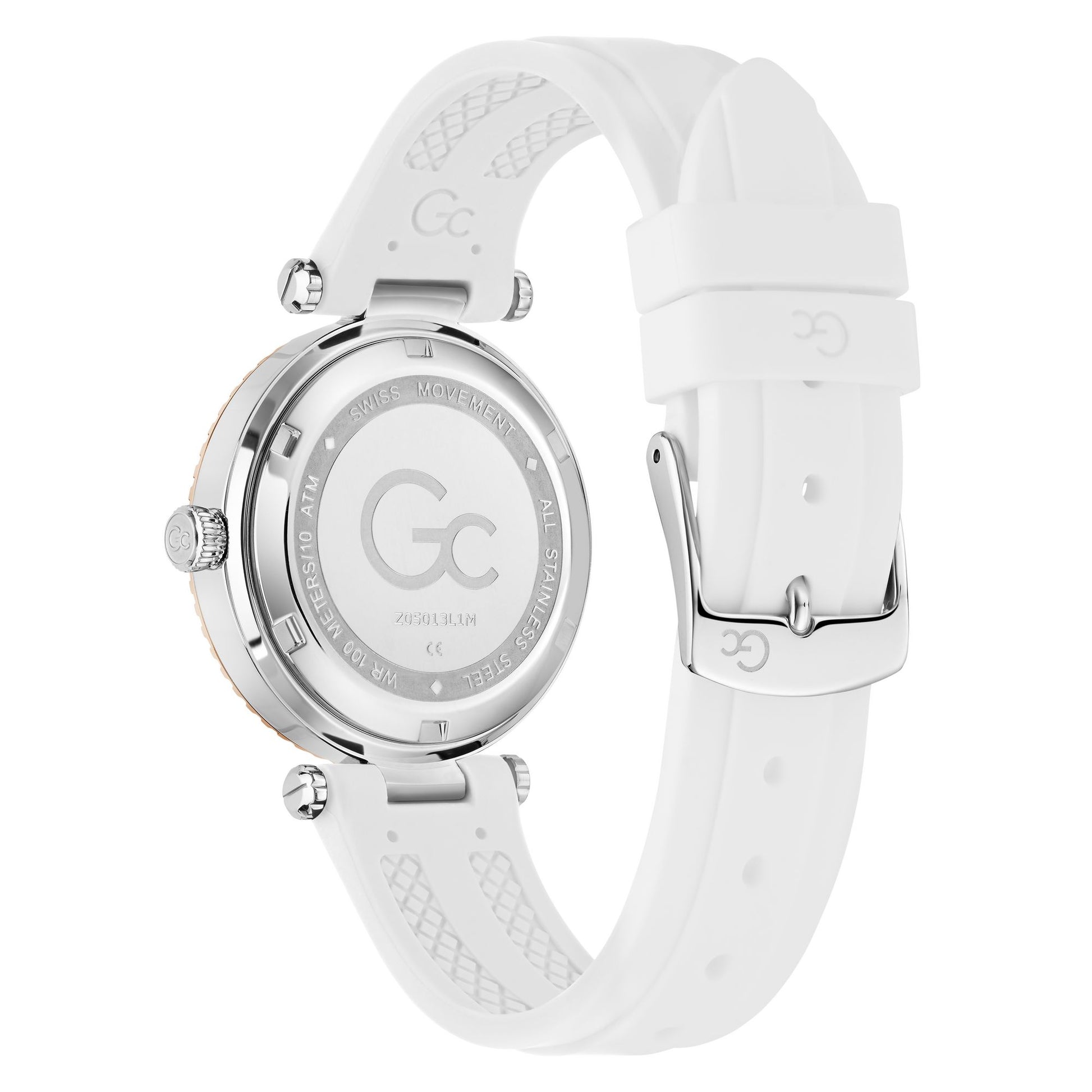 This 34 mm watch features a precise Swiss movement encased in a polished silver and rose gold PVD case, complemented by a clean white dial for optimal legibility. The white silicone strap offers both comfort and durability, while sapphire-coated mineral glass ensures excellent clarity. An elegant, reliable timepiece designed for discerning experts.