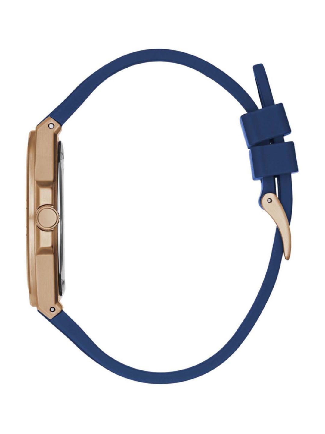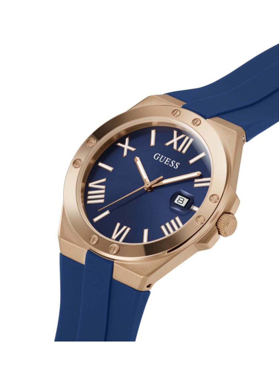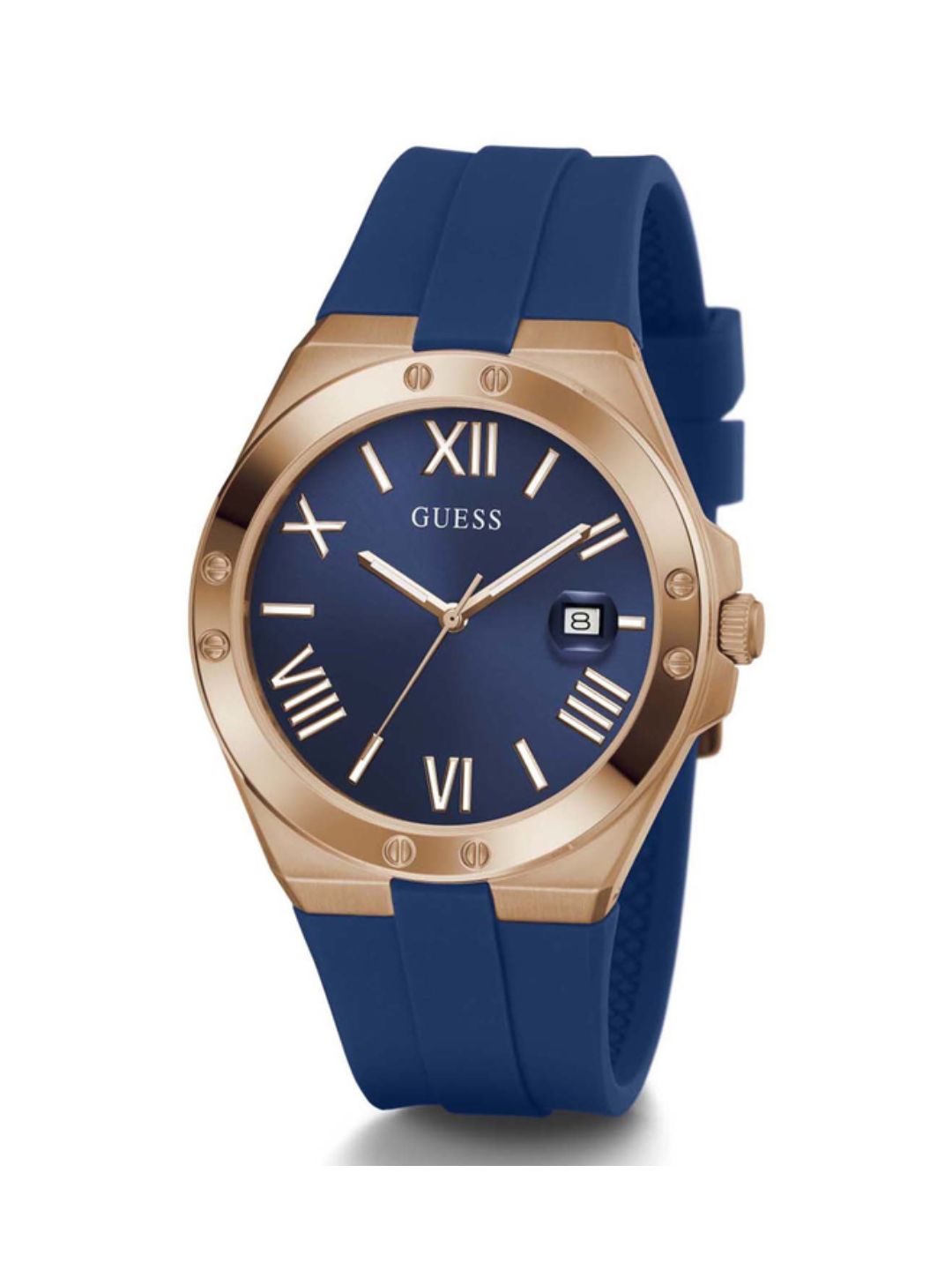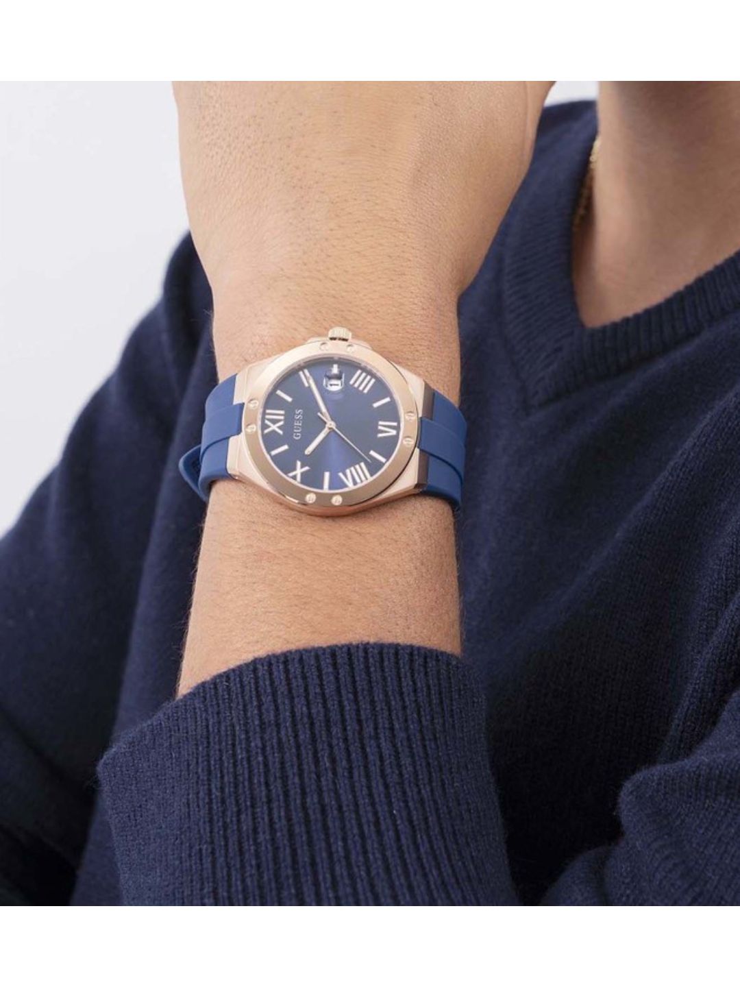 The Guess Analog Blue Dial Men's Watch has an analog display and is 50 M water resistant, making it ideal for casual events. This watch, made with a brass dial and silicon band, comes with a one-year warranty and mineral glass for added durability. The 41 mm dial, 16 mm case thickness, and 24 mm strap width provide a comfortable fit. To keep it looking its best, use a cotton cloth to clean the dial.