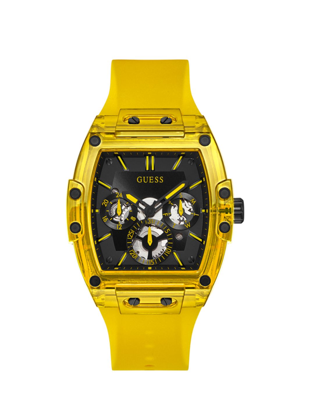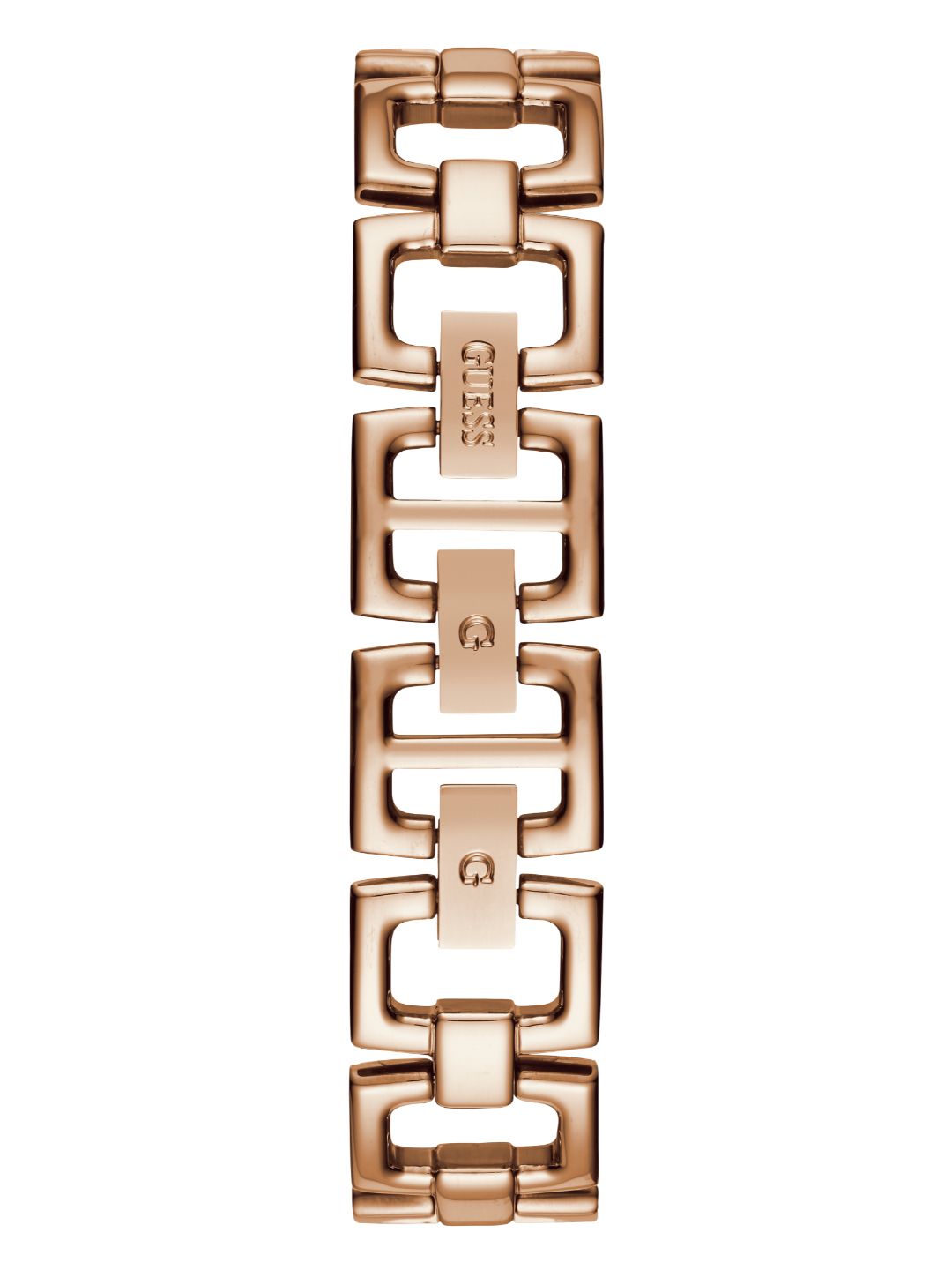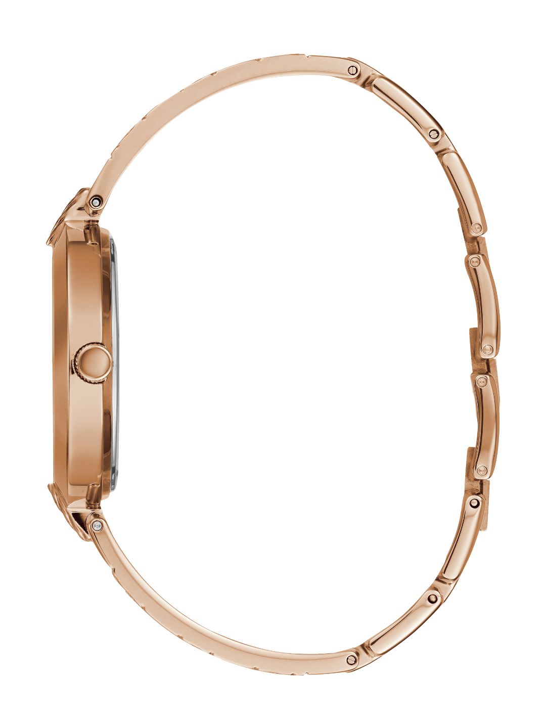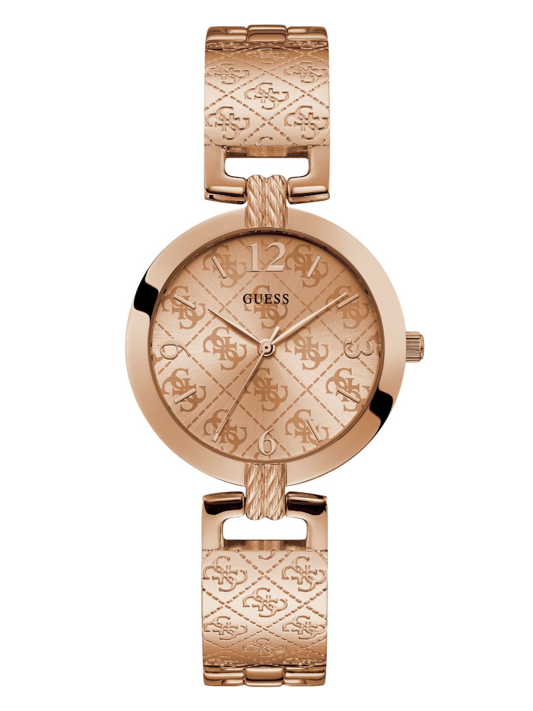 - Enrich your watch collection with this women's analog watch from Guess. Housed in a 35 mm case, the rose gold round dial vaunts plain three hands, numeral markings at quarter intervals, bold stick indices for rest of the hours and a crown for time adjustment. The stainless steel strap showcases a rose gold hue that uplifts the look of the watch. Moreover, it is fitted with a jewellery clasp to ensure a secure fit on the wrist.