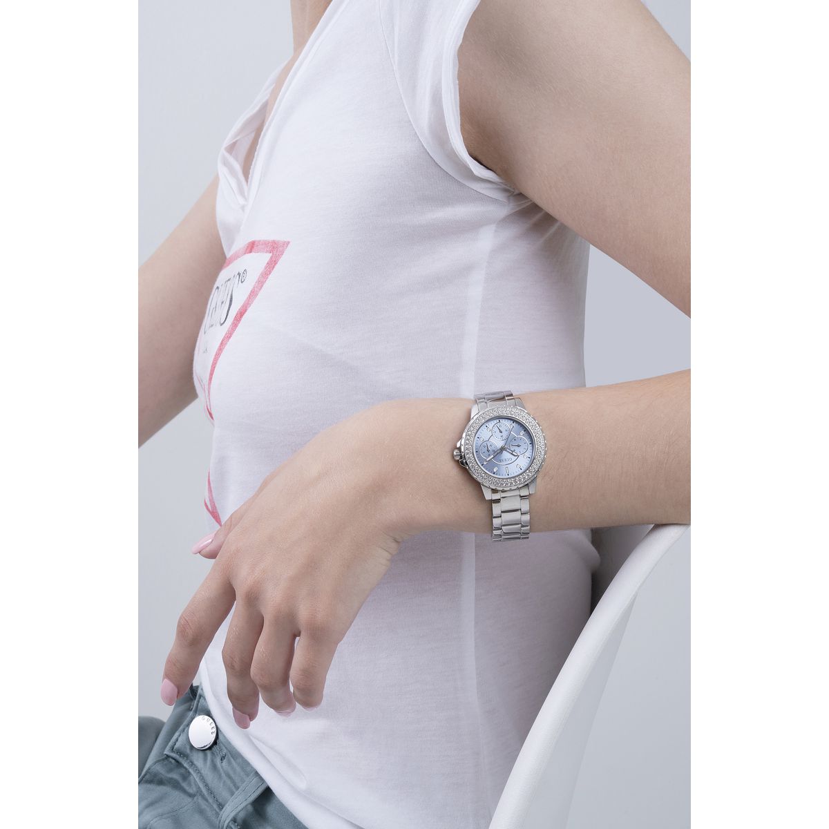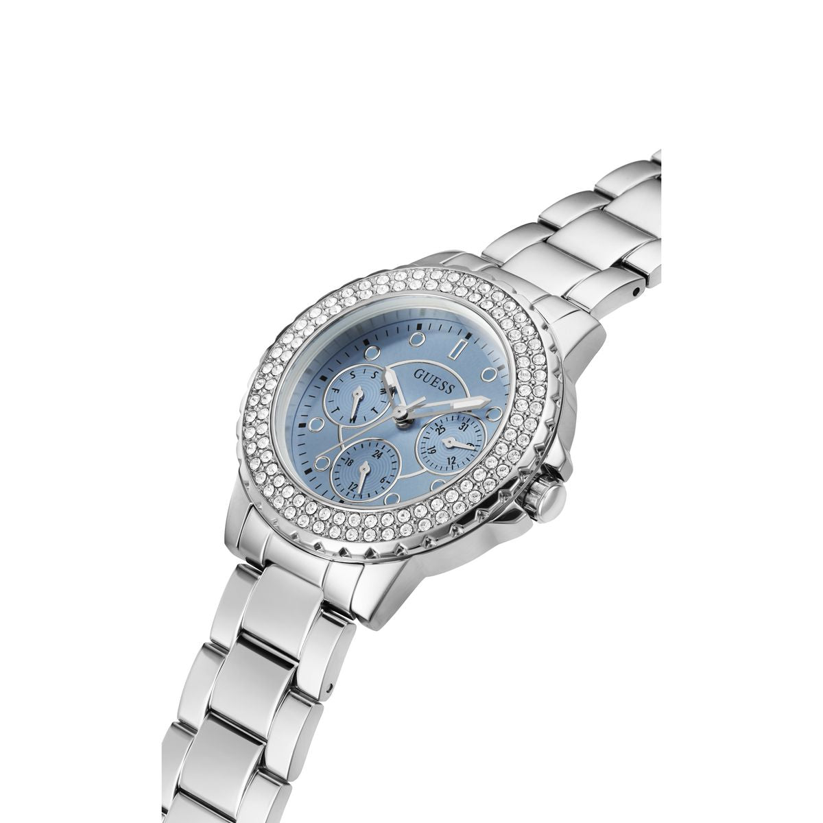 Elevate your style with the elegant Guess Blue Dial Women Analog Watch. The stunning blue dial, paired with a silver tone stainless steel strap, exudes sophistication and class. This timepiece is perfect for any occasion, providing both fashion and function with its precise analog movement.