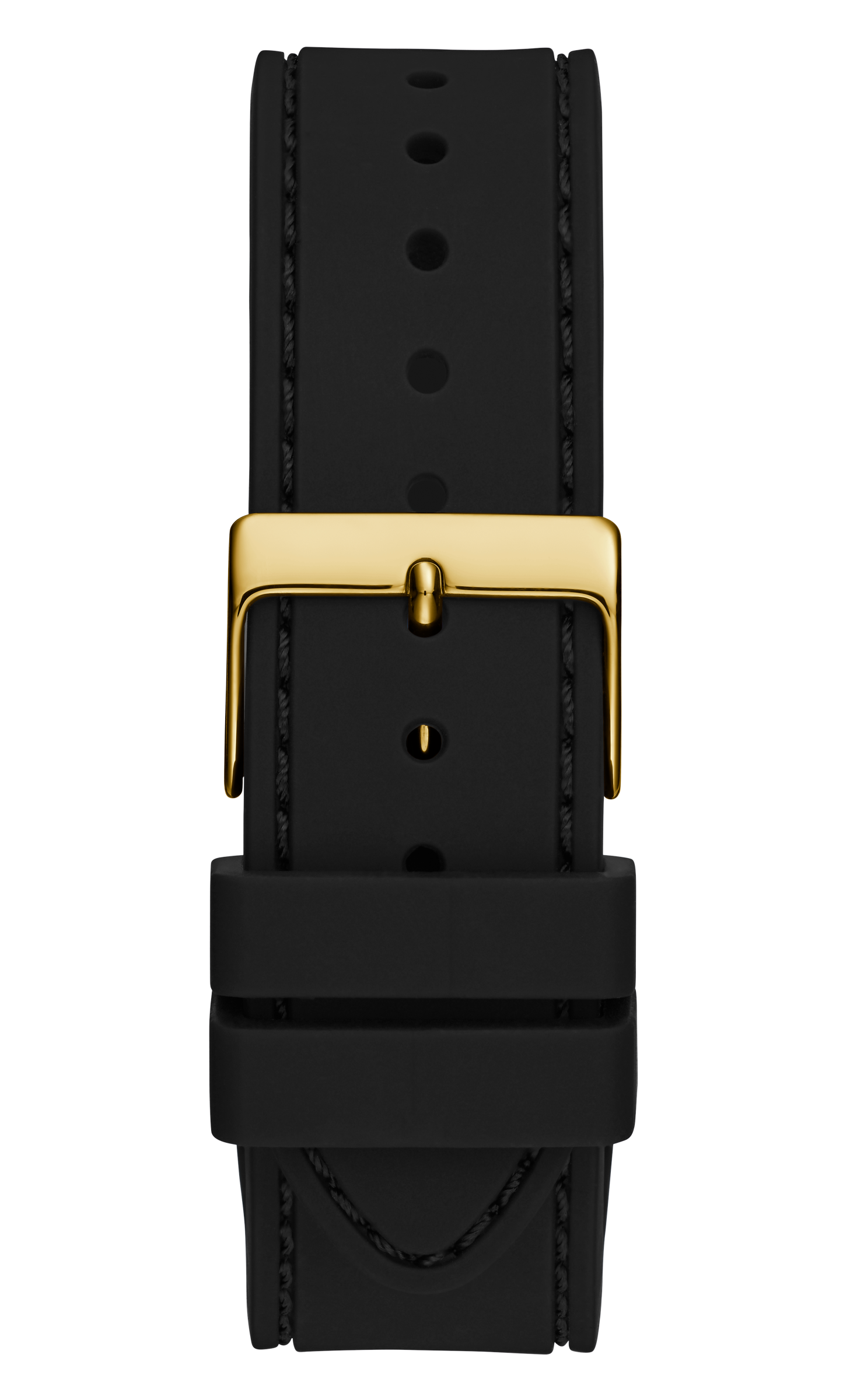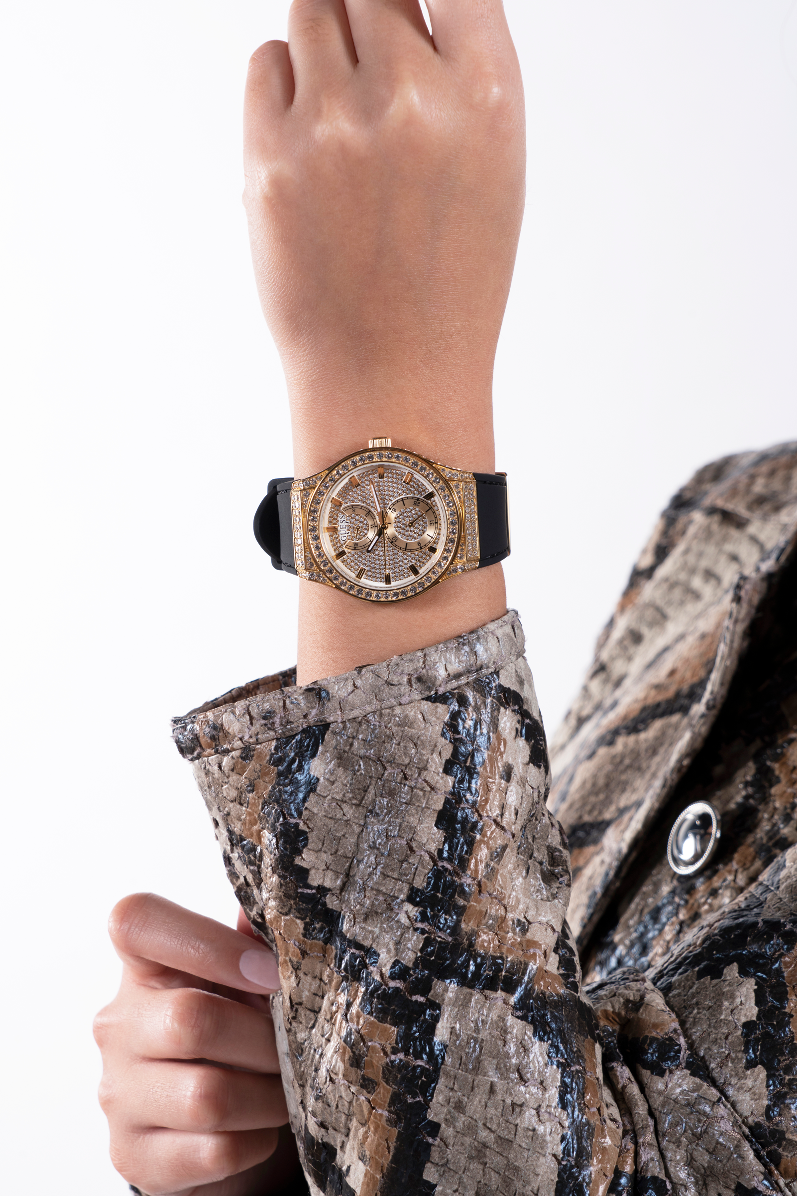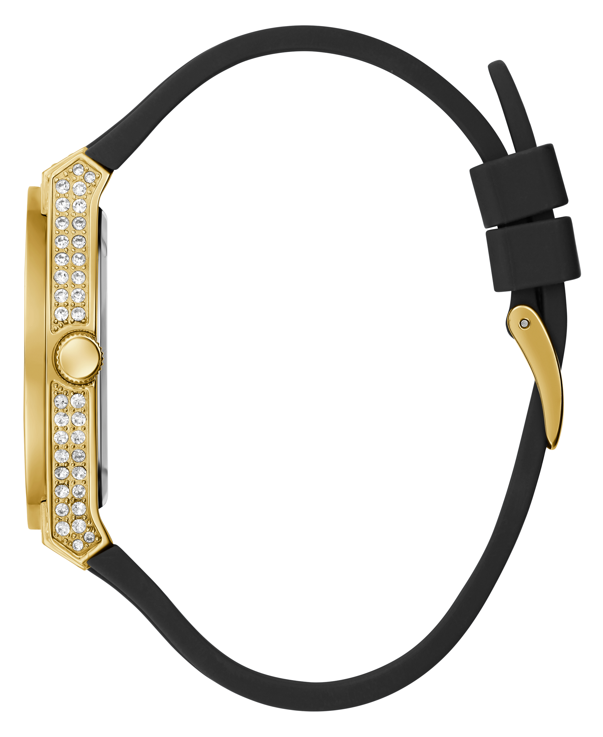 Introducing the Guess Gold Dial Women's Watch. This?áround?áwatch has a 39 mm gold dial with an analogue display, a sturdy silicon band, and a battery-powered quartz mechanism. It is excellent for casual occasions, as it is water resistant up to 30 meters. The one-year warranty assures quality. The package consists of one watch. To keep it looking its best, use a cotton cloth to clean the dial.