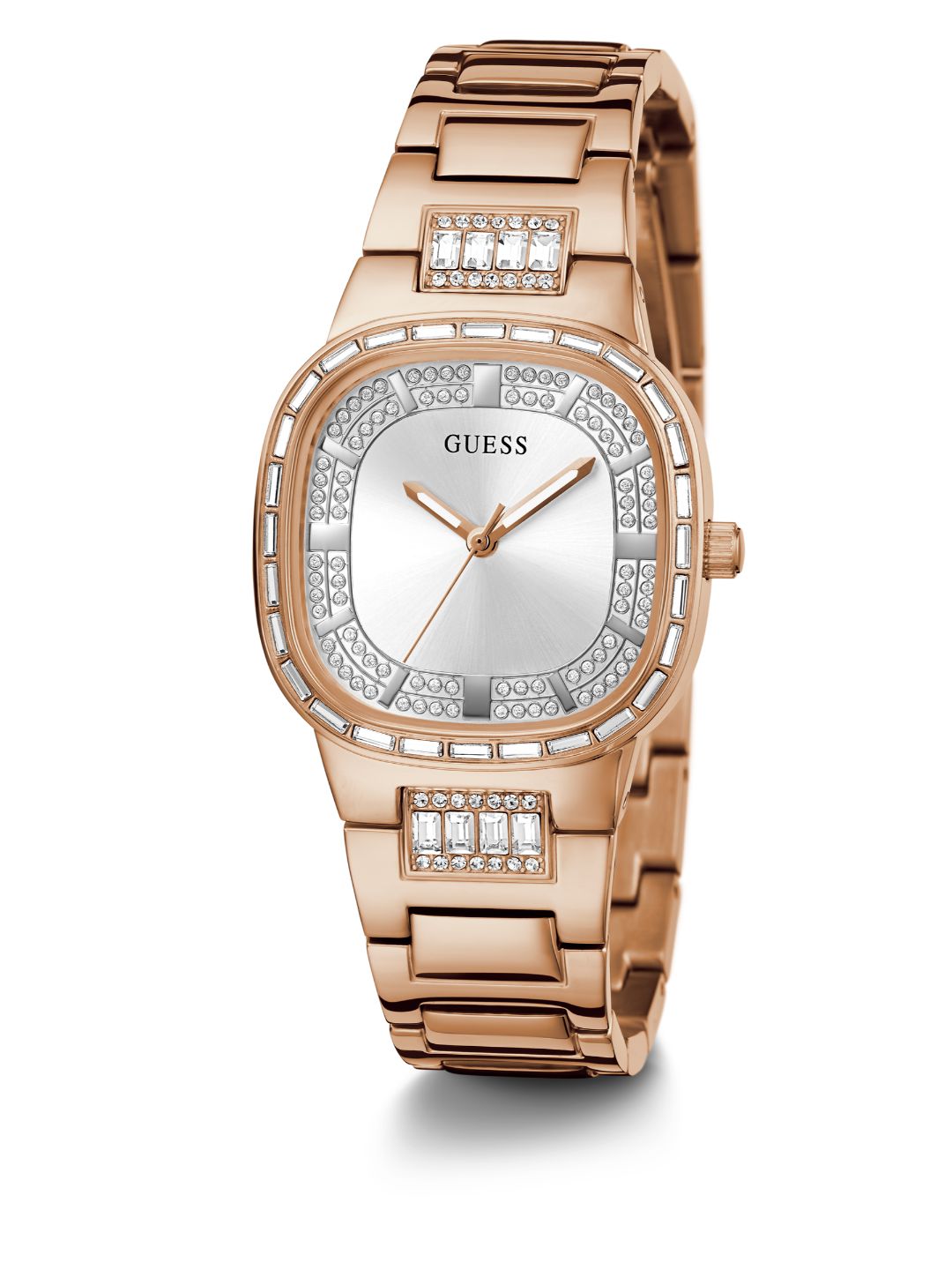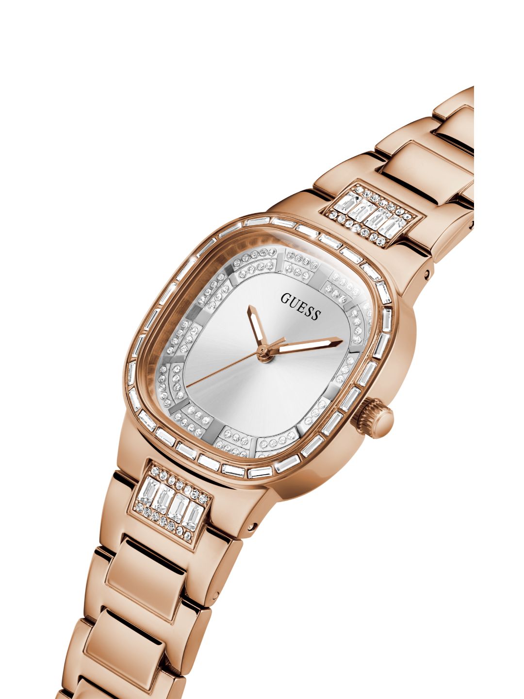 Ready to make a statement with the Guess Ladies Dress Silver Watch. This elegant watch features an analogue display and a round silver toned dial encased in a durable stainless steel case. This watch is ideal for everyday wear because it is water resistant to 30 meters and has scratch-resistant mineral glass. The rose gold strap adds a touch of elegance, making it appropriate for both casual and formal events. This watch is powered by a quartz movement and a battery, and it has a one-year warranty. This classic accessory will elevate your look. To keep it looking its best, use a cotton cloth to clean the dial.