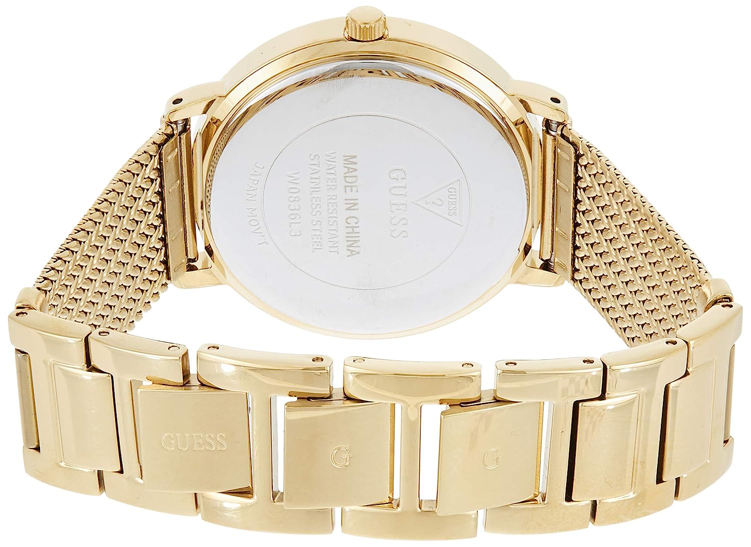 This Guess Ladies Gold Analog Watch is an ideal combination of elegance and functionality. Its round case?áand stainless steel band material provide a sleek and sophisticated look. This watch is ideal for any casual event,?áit has an analog display and is water resistant to 30 meters. The battery-powered quartz movement and solid brass dial ensure precise timekeeping, and the warranty lasts one year. To keep it looking its best, use a cotton cloth to clean the dial.