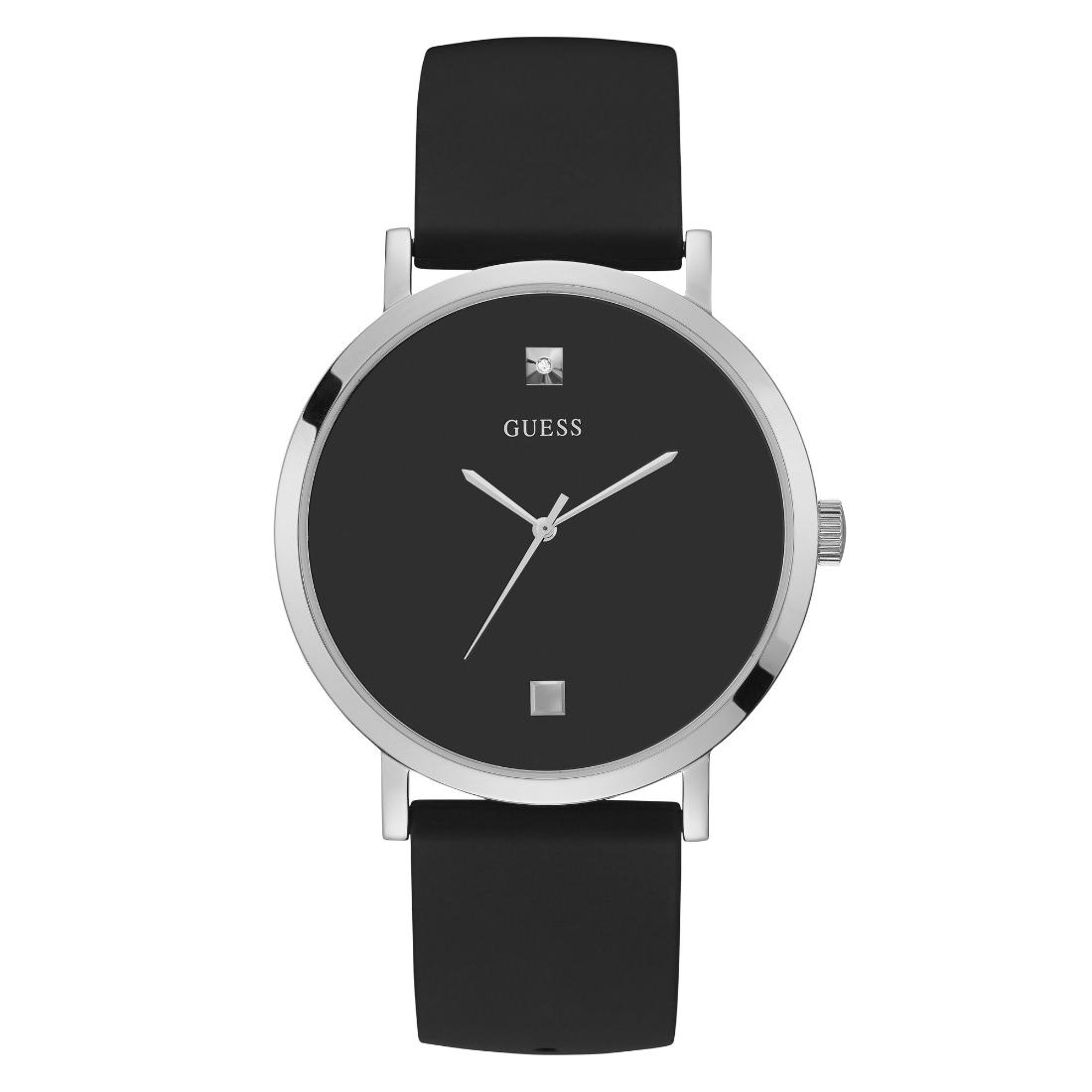 Expertly crafted by Guess, this men's watch boasts a sleek 44mm black dial with analog display. The elegant design combines with precise timekeeping to effortlessly elevate your style and punctuality. Constructed with high-quality materials, this watch is sure to impress for both formal occasions and everyday wear.