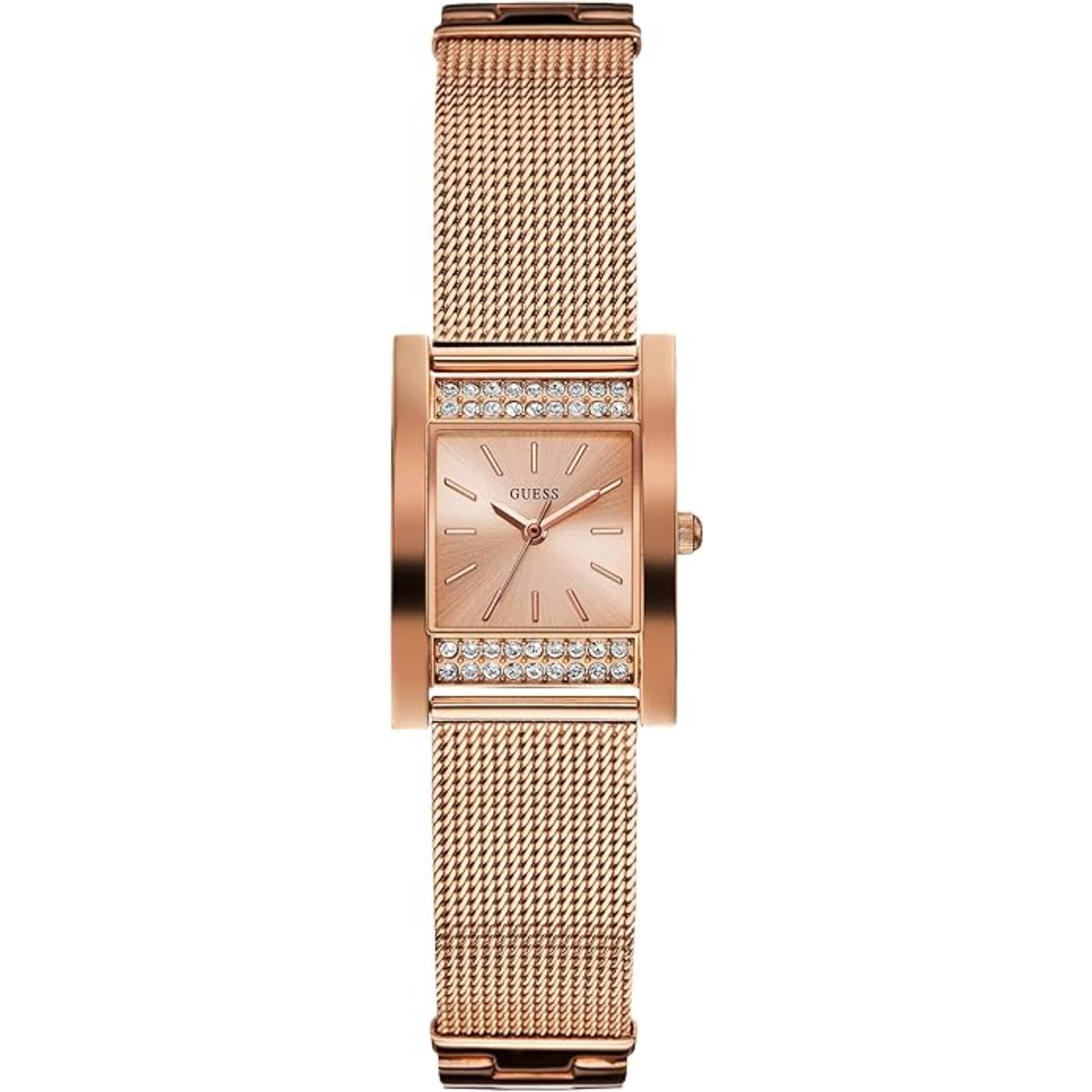 Guess Rose Gold Dial Women Analog Watch - Dial Color: Rose Gold, Dial Shape: Rectangle, Case Material: Stainless Steel, Movement: Quartz, Water Resistance: 10 m, Strap Color: Rose Gold Tone, Strap Material: Stainless Steel/Mesh, Closure: Deployant, Display Type: Analog Watch, Case Thickness: 8.61 mm, Case Diameter: 22 mm, Strap Width: 16 mm