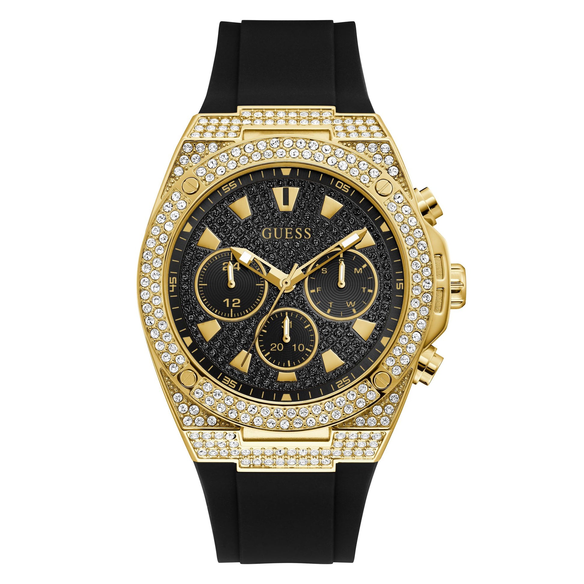 Make an impact with this Guess Sport watch, a commanding 45mm timepiece featuring a striking black dial built for the modern active man. This analog watch merges athletic performance with bold contemporary design, delivering a versatile companion for both intense workouts and casual everyday wear. The expansive case provides excellent visibility and presence, while the classic black dial ensures seamless coordination across your lifestyle. Constructed with Guess's rigorous standards for durability and precision movement, this watch endures demanding conditions without sacrificing style. A statement piece that captures your energetic spirit, offering reliable timekeeping and distinctive character that reflects your dynamic approach to life.