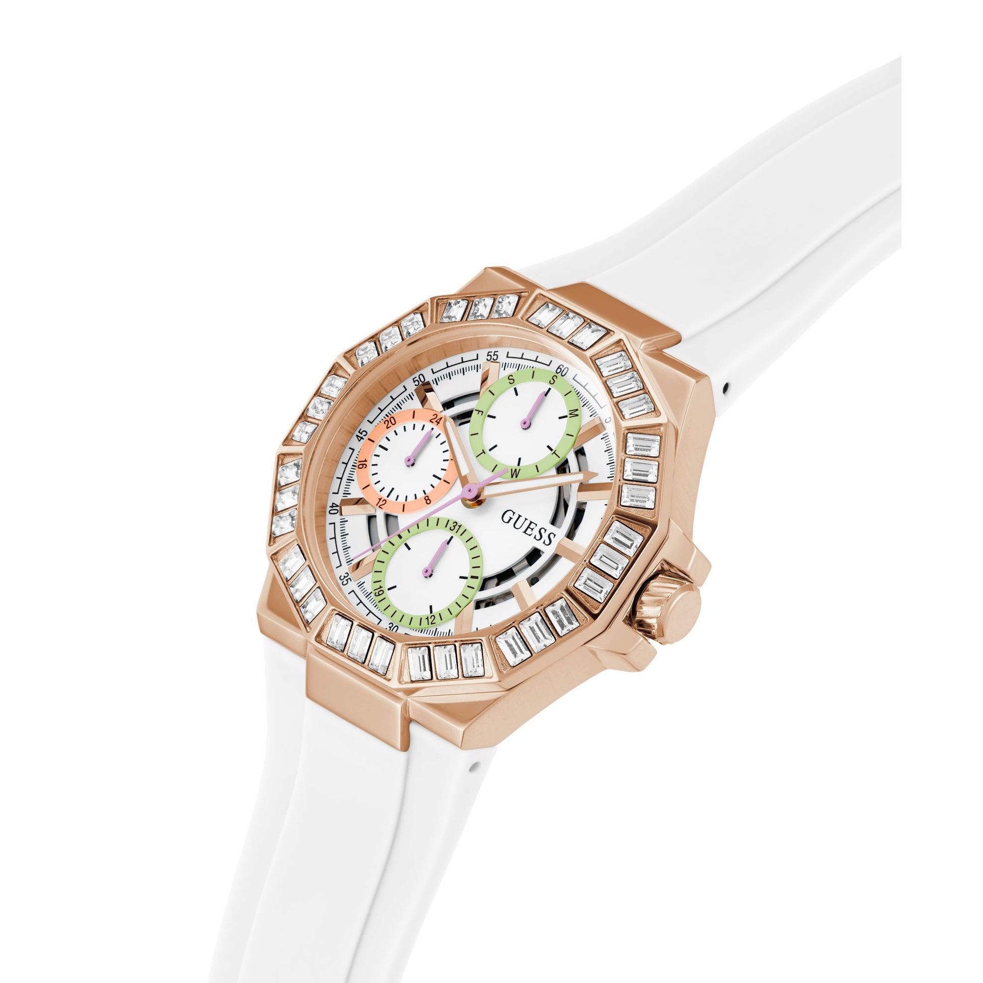Command contemporary style with this Guess Trend chronograph, featuring a striking 39mm white dial that embodies modern minimalism and sophistication. The substantial case size delivers excellent functionality and visual presence, appealing to those who appreciate bold, fashion-forward design. The pristine white dial provides exceptional contrast and readability while maintaining a clean, uncluttered aesthetic aligned with current design trends. The chronograph complications add practical versatility, enabling precise timing for both athletic pursuits and everyday activities. Built with meticulous craftsmanship and contemporary sensibilities, this timepiece represents the perfect fusion of trend-conscious styling and reliable performance for the modern woman.