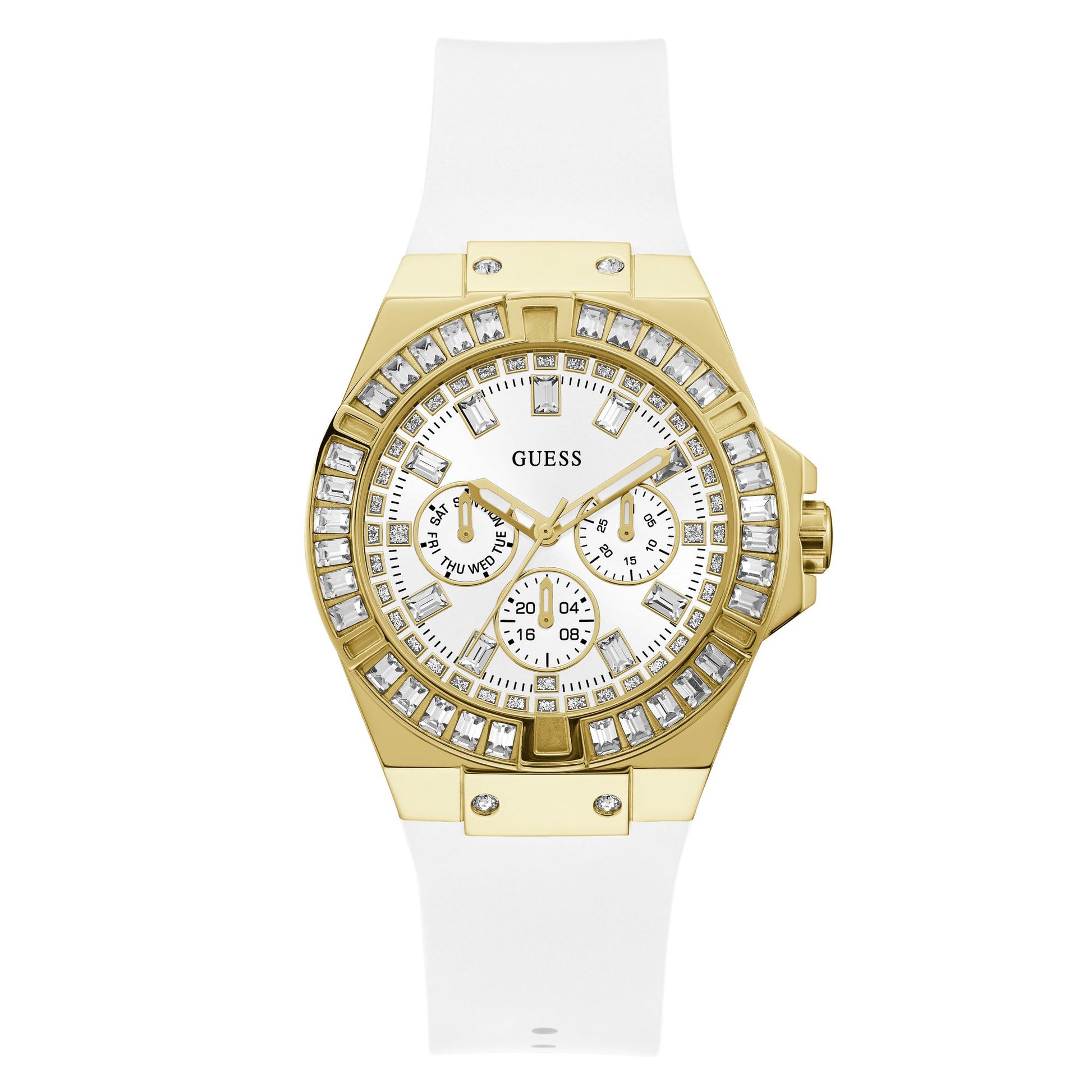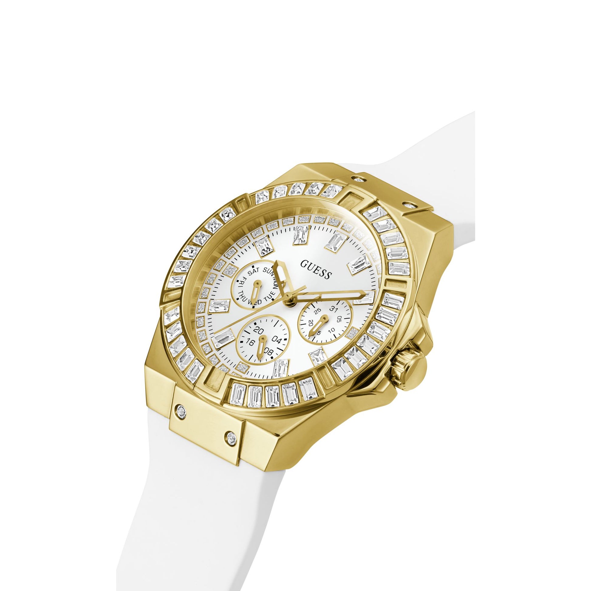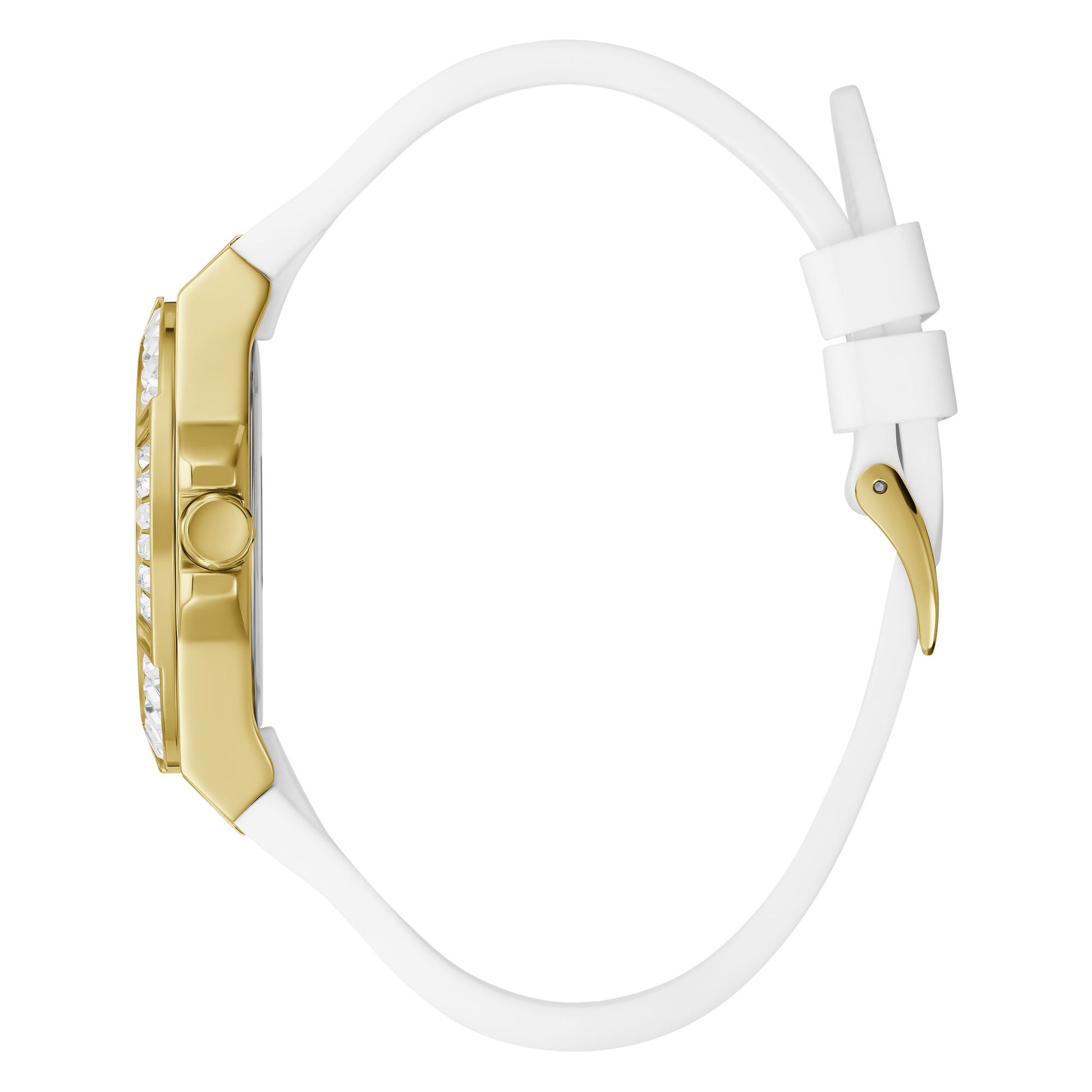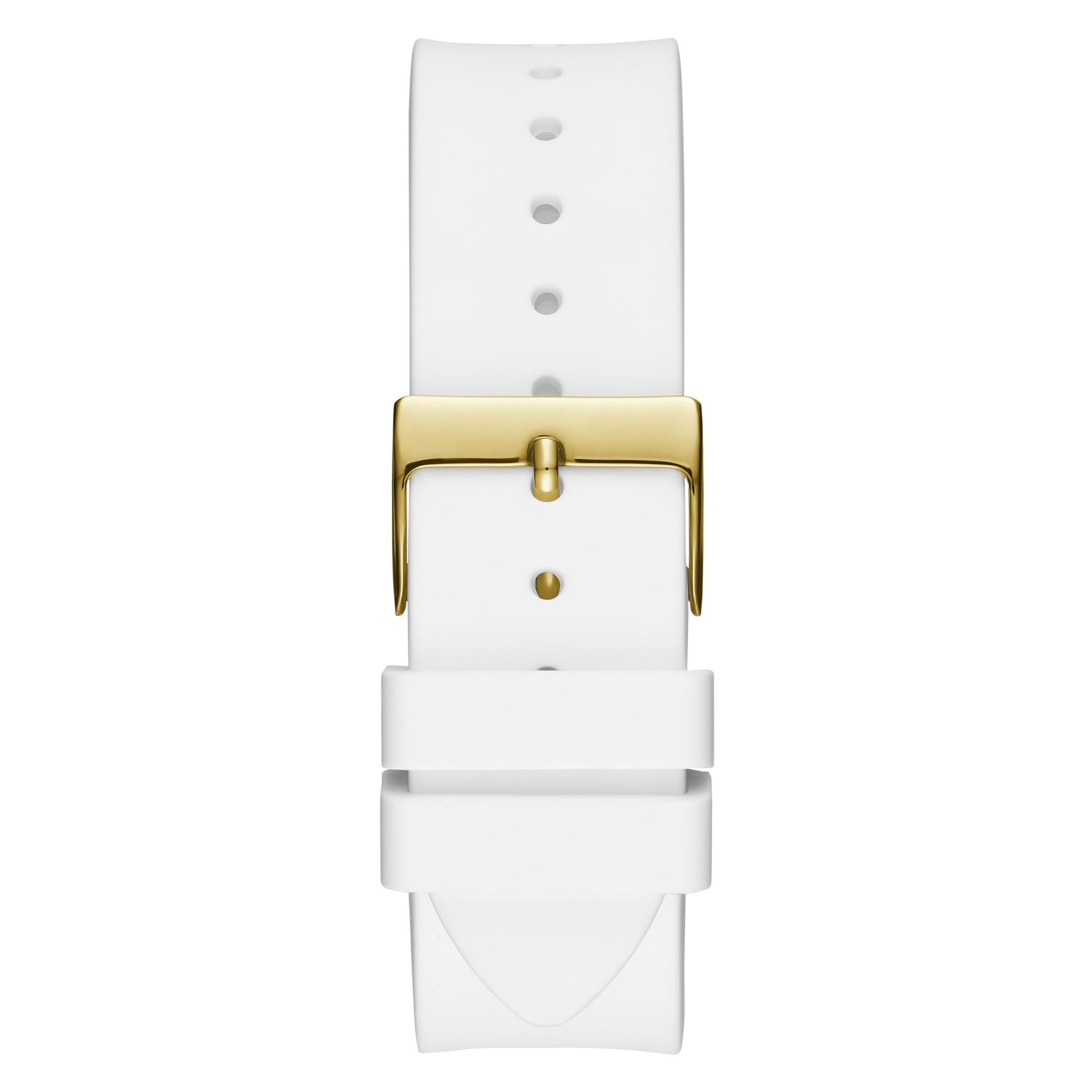 Introducing the Guess White Dial Women's Analog Watch. This watch?áhas an?áelegant white dial, gold-tone stainless steel case?áand comfy silicon band, is ideal for casual occasions. It is made to last, with a water resistance of 50 meters and a strong mineral glass. Furthermore, with a one-year warranty and an easy-to-use quartz movement. Add this stylish and practical timepiece to your collection now. To keep it looking its best, use a cotton cloth to clean the dial.