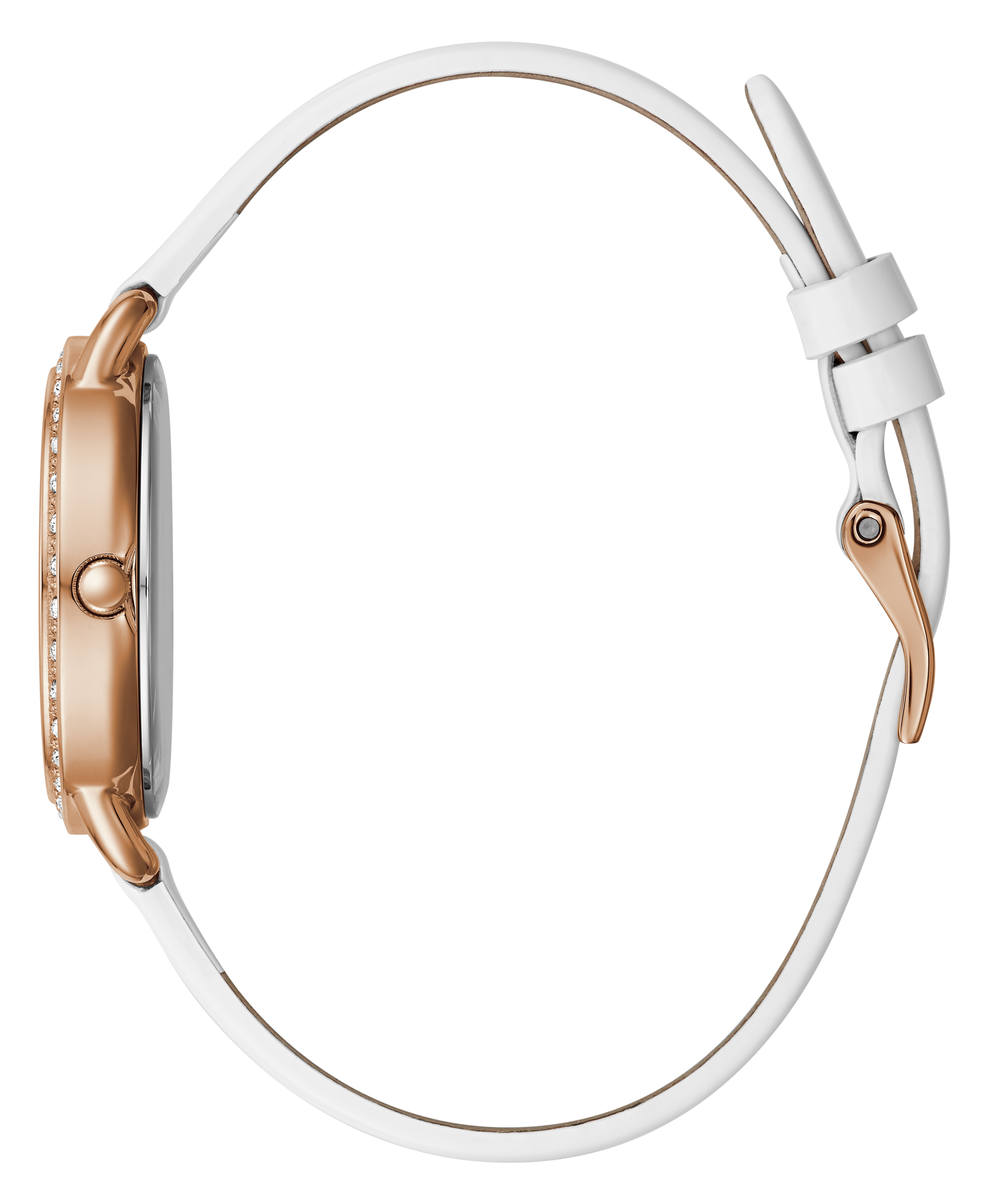 The Guess Women's White Dial Analog Watch is a fashionable and reliable option for any casual event. This watch is both useful and fashionable, with a water resistance of 30 meters, a leather band, and Quartz movement. The one-year warranty?áand mineral glass material enhance its durability and value. This gorgeous timepiece will help you step up your watch game. To keep it looking its best, use a cotton cloth to clean the dial.