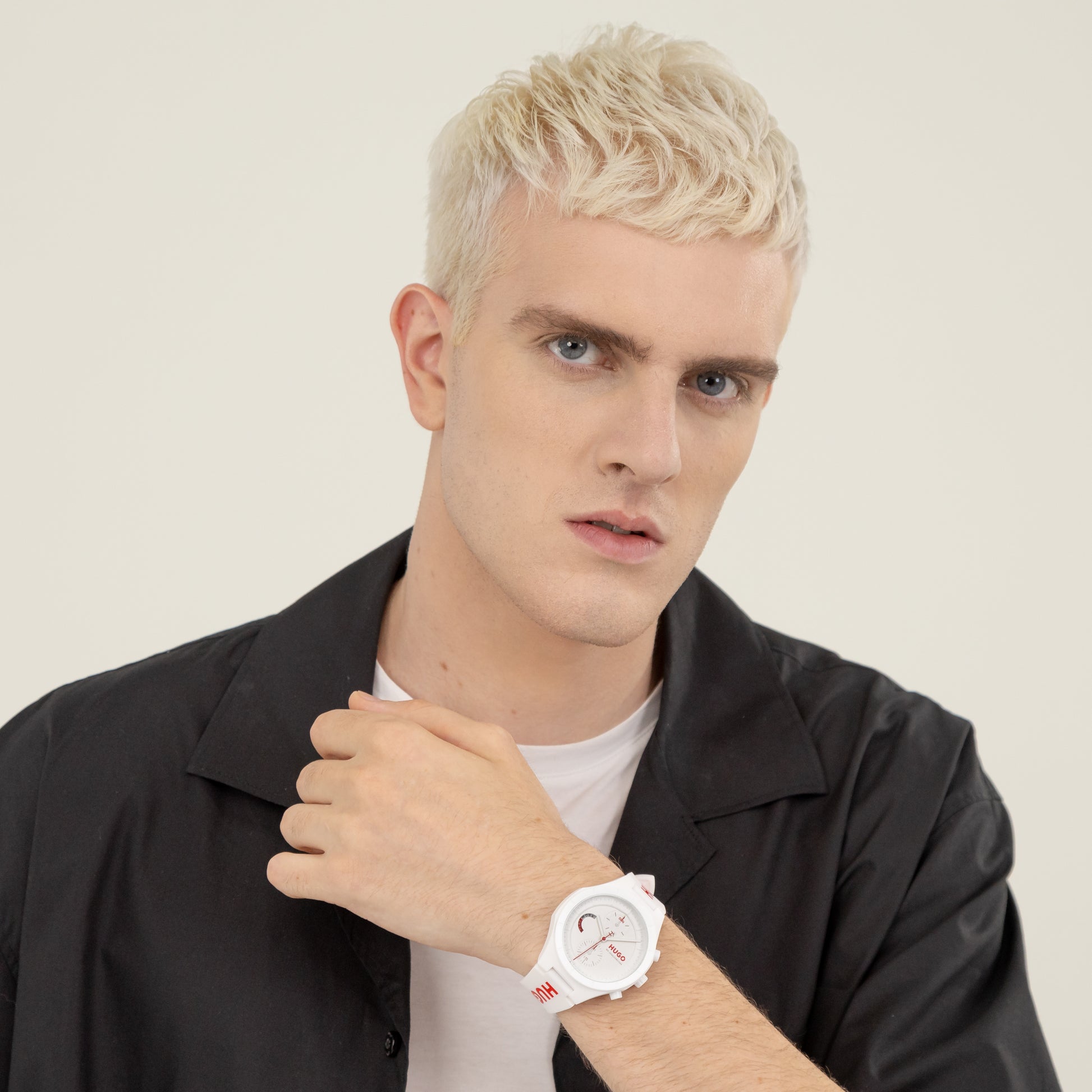 The Hugo Boss LIT MULTI Quartz watch for men features a crisp white round dial paired with a durable synthetic leather band in multicolor, combining clean design with comfortable wear. Its precise quartz movement ensures accurate timekeeping and minimal maintenance. This timepiece offers a versatile and sophisticated accessory, ideal for men who appreciate contemporary style alongside reliable performance.