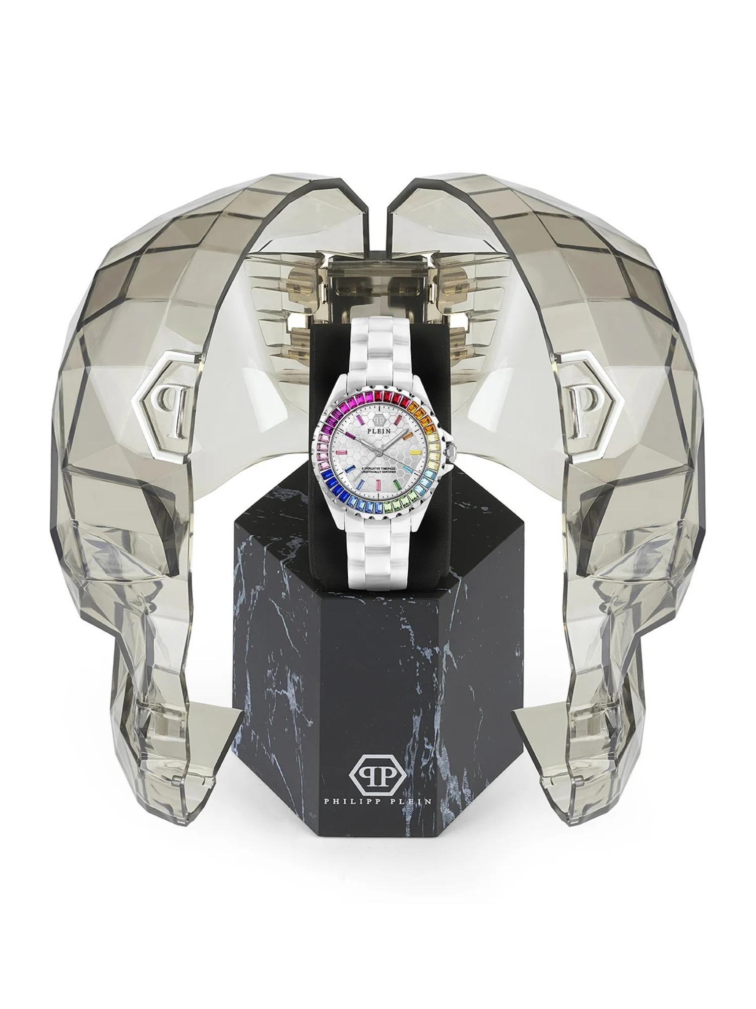This Philipp Plein women's watch features a 38 mm size and a white dial, making it a stylish and functional accessory. The analog display allows for clear and accurate timekeeping, while the sleek design adds a touch of sophistication to any outfit. Elevate your look with this must-have watch.