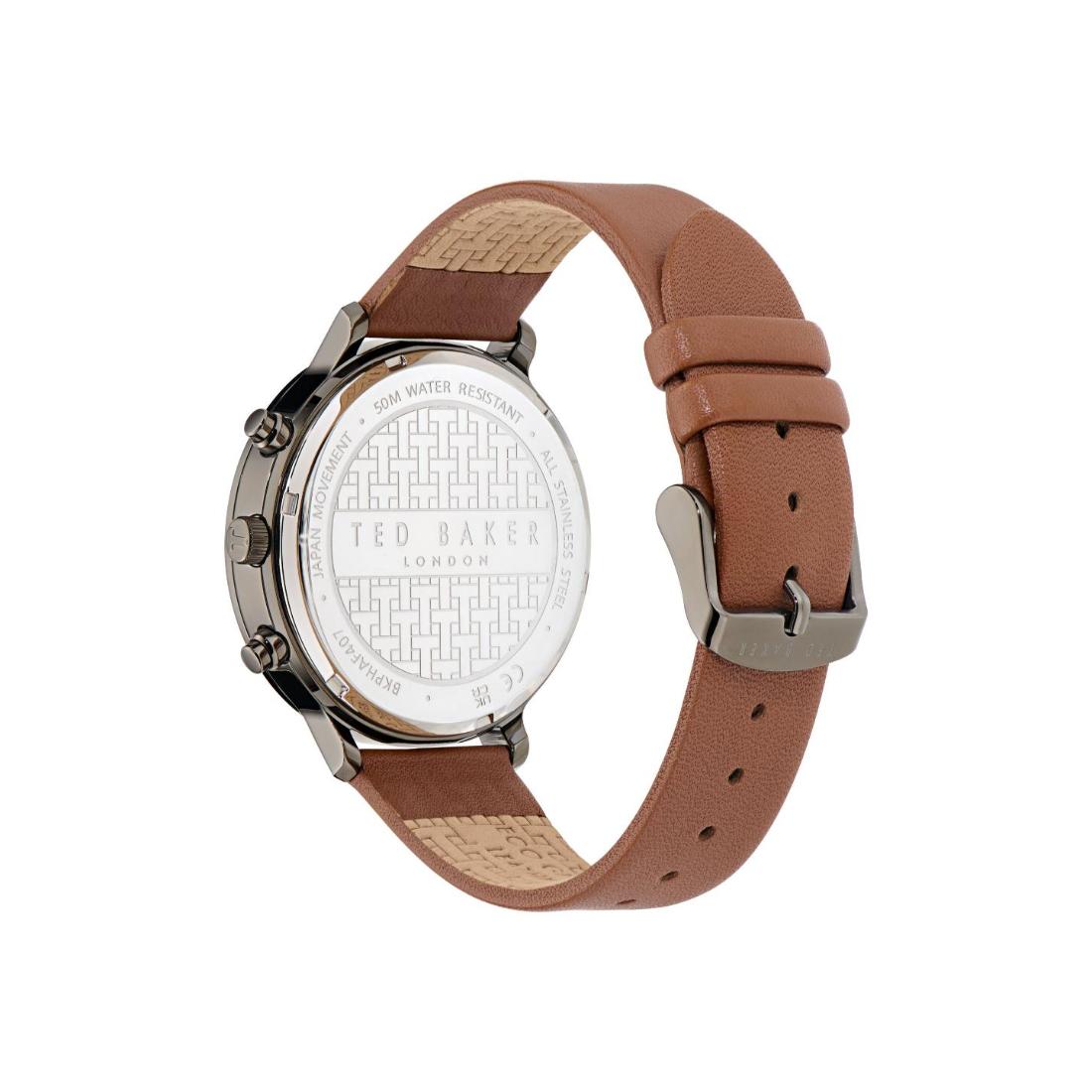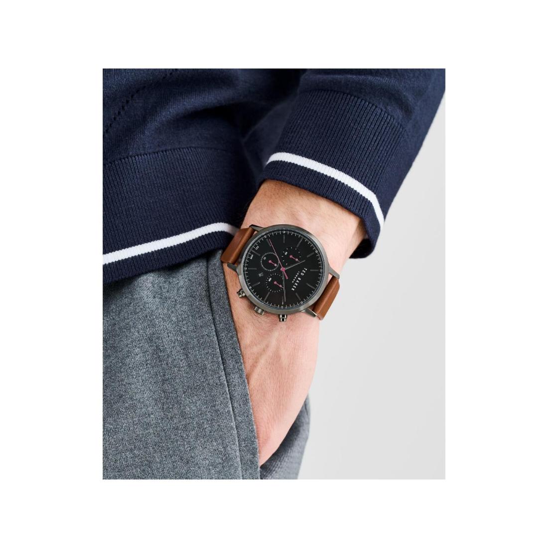 Explore Ted Baker's latest addition: Haarvin, a chronograph watch featuring a 44 mm case. It's the perfect accessory to add a touch of modernity to your outfits while maintaining a timeless style. Discover it with the tan leather strap and the black case , now available with a 100% sustainable source package.