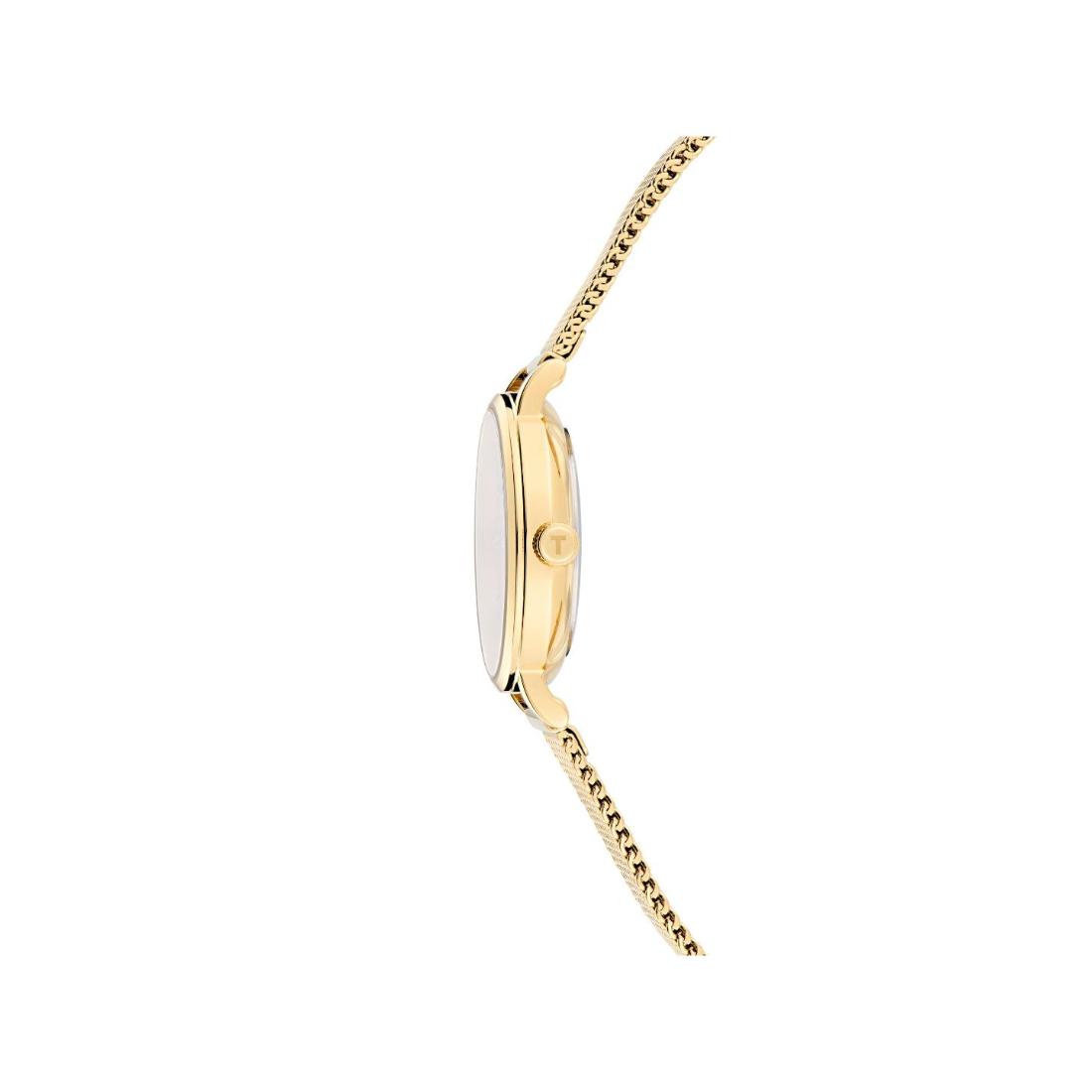 The 28 mm case is enriched by a sunray dial with tonal crystals as indexes and completed by a yellow gold mesh bracelet.