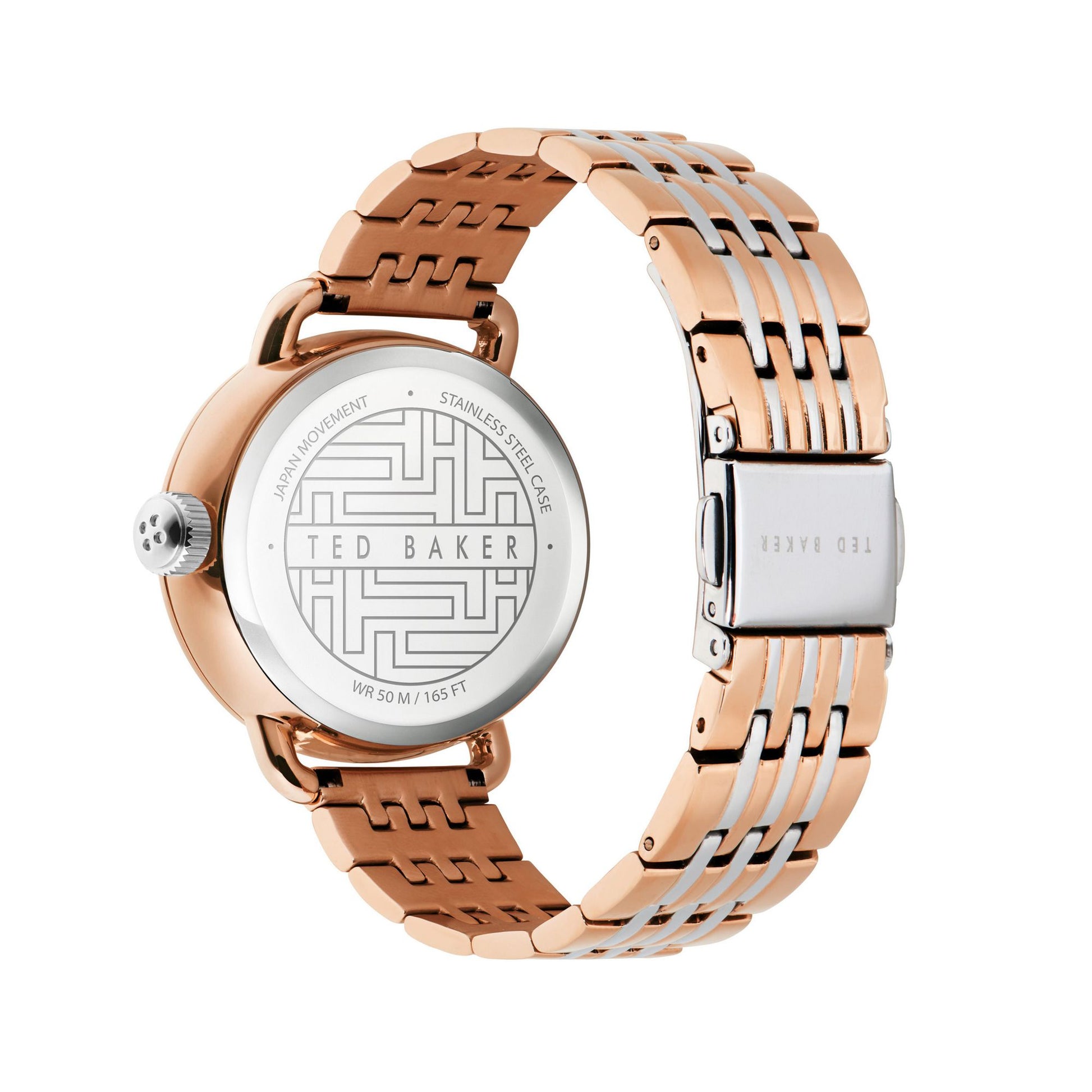 Expertly designed by Ted Baker, this White Dial Women's Watch in Two Tone Stainless Steel exudes elegance and sophistication. With a 50m water resistant, Quartz movement, and a one-year warranty, this watch is ideal for any casual event. This watch, with its solid white dial, 34.5mm case, and mineral glass, is an excellent choice for a fashionable yet functional accessory. To keep it looking its best, use a cotton cloth to clean the dial.