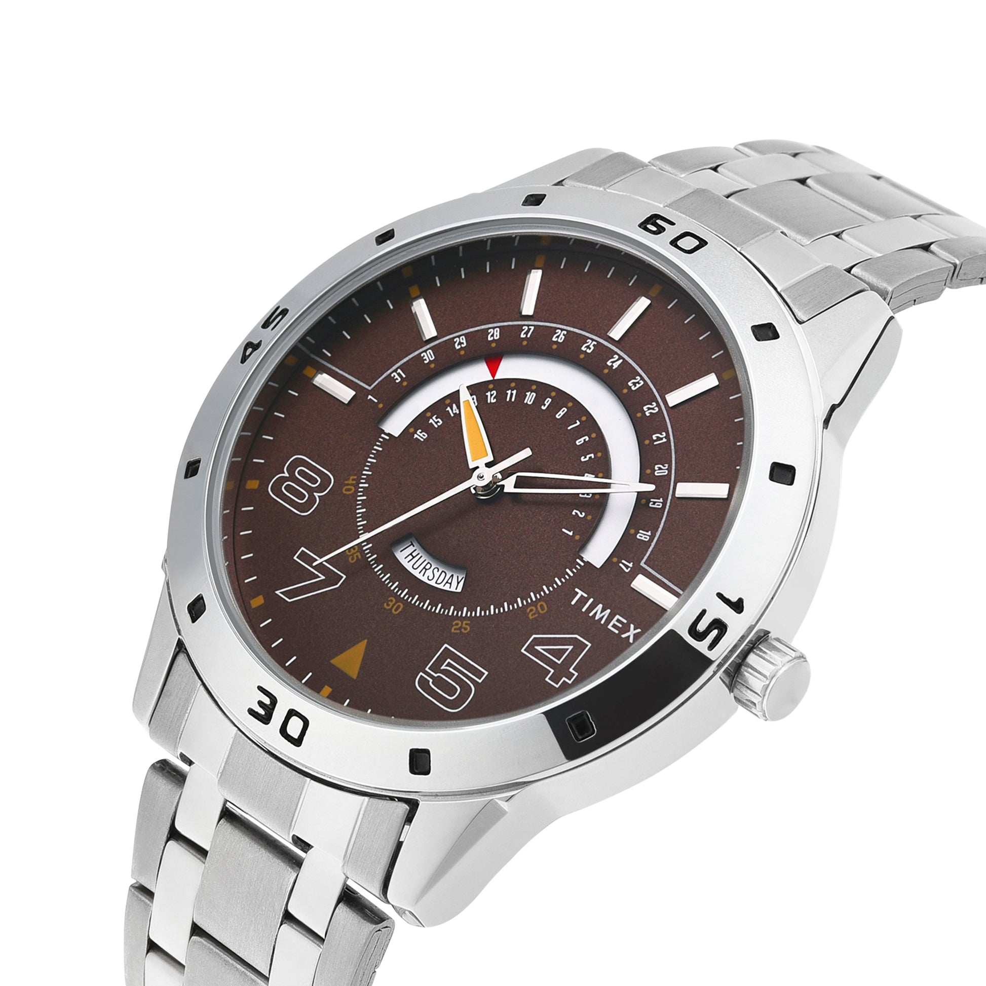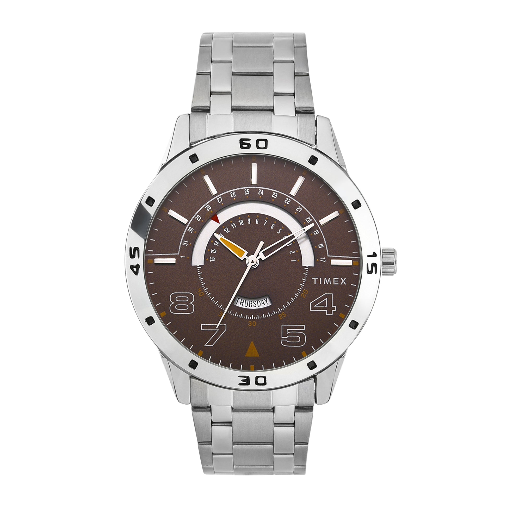 The Timex Analog Brown Dial Men's Watch features a sleek silver-toned band with a dark brown dial, making it a fashionable and dependable option for any casual event. This watch is both accurate and long-lasting,?áit has?áquartz movement and 30 M water resistance. The one-year warranty and mineral glass make it an excellent investment.To keep it looking its best, use a cotton cloth to clean the dial.