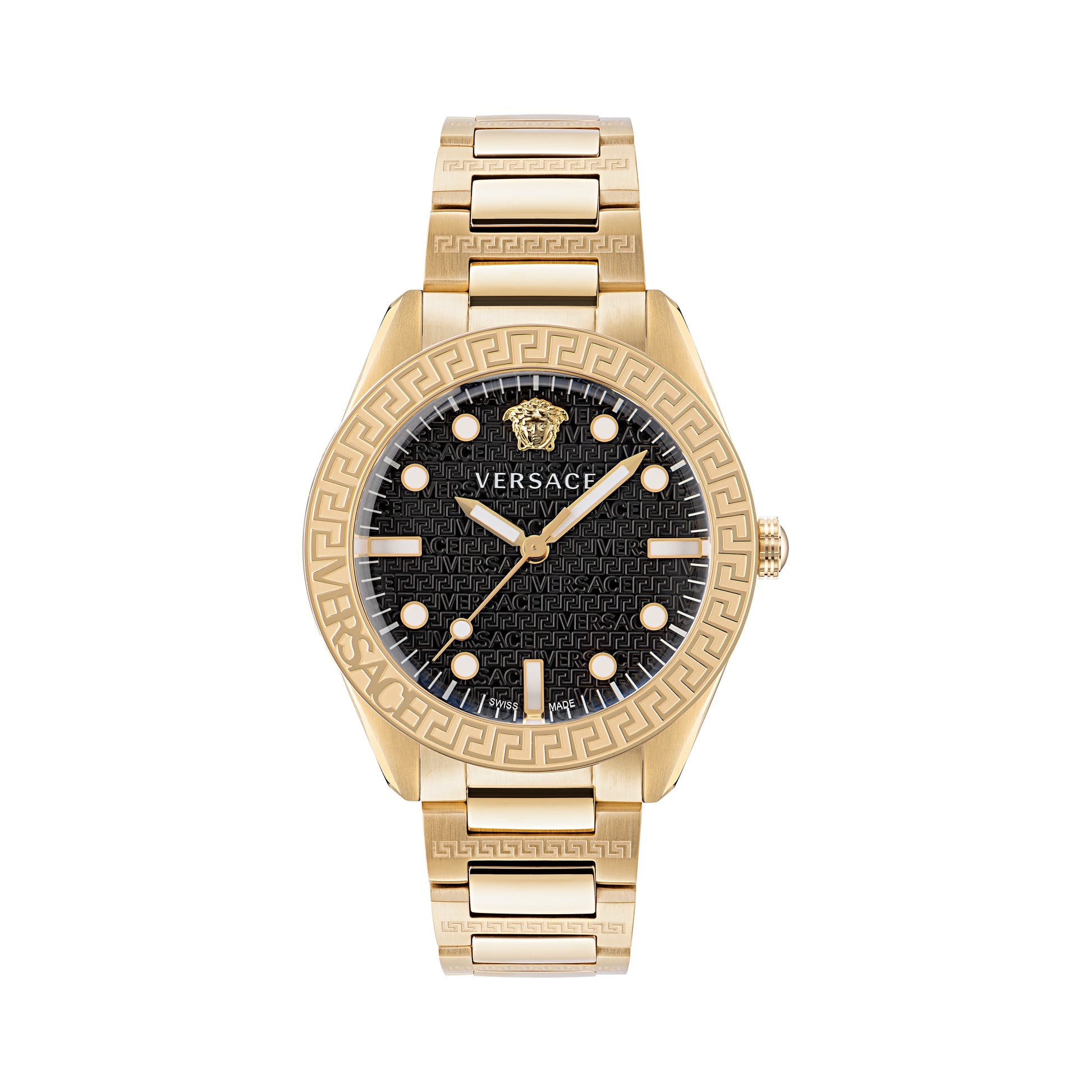 - This iconic 42 mm watch has an incredible and innovative design, characterized by a dome shaped glass and a bold top ring with Versace lettering and Greca finishing. The dial features a 3 hands movements, bold indexes to give strong personality, a Versace logo pattern to celebrate the brand and the 3d Medusa head at 12h. The collection is available in leather strap with Versace logo embossed or the bracelet version.