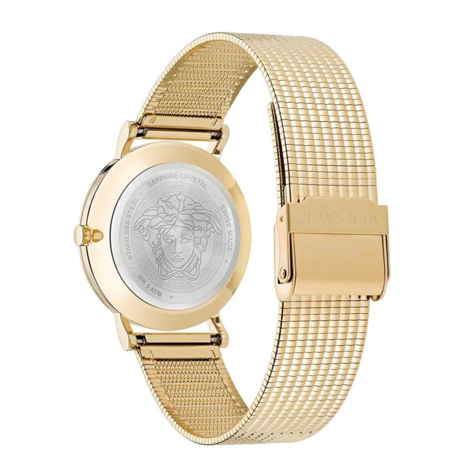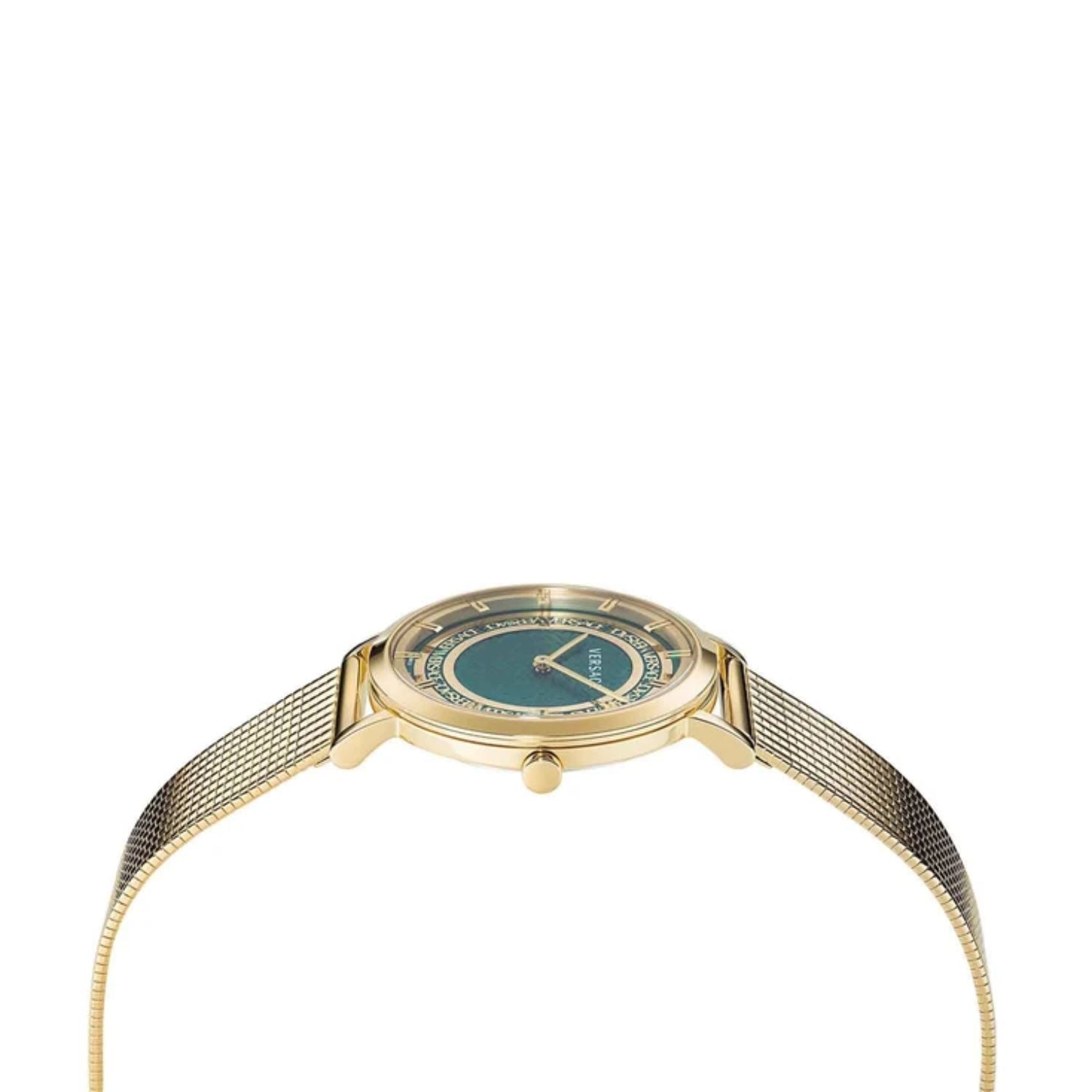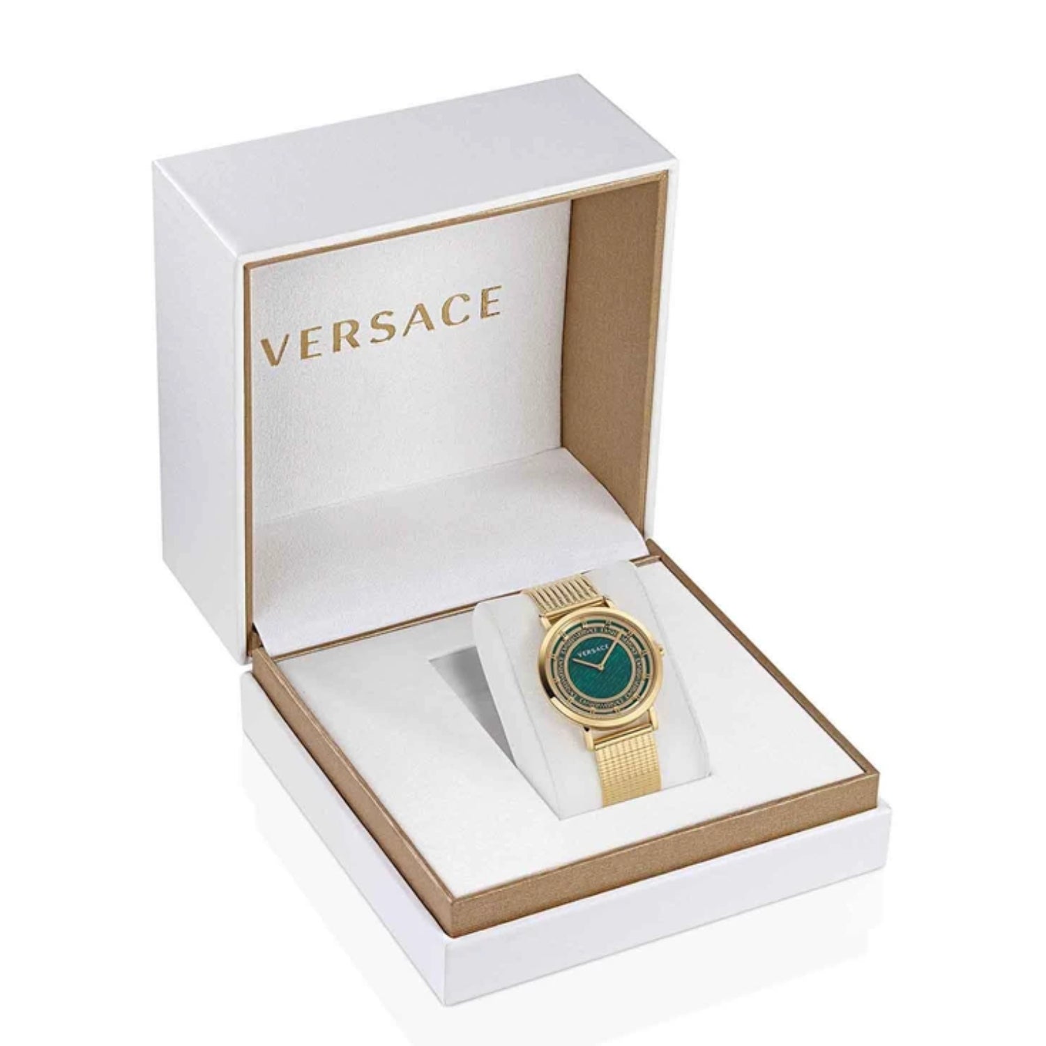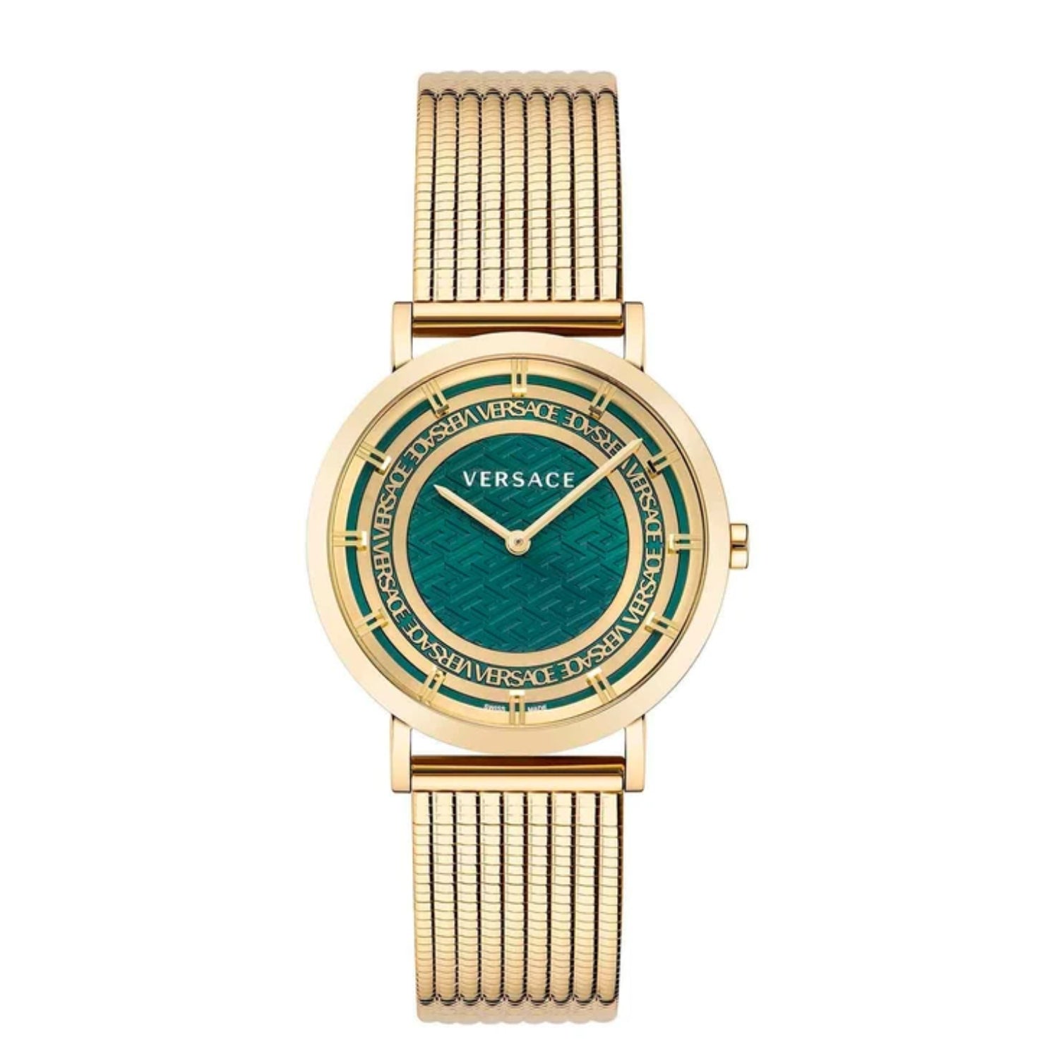 The Versace Green Dial Men's Watch is expertly created with precision and style, featuring a bright green dial with gold-toned accents. The analog display and quartz mechanism provide precise timekeeping. With a 50-meter water resistance and sapphire glass, this flexible watch is ideal for casual events. The sales package includes a one-year warranty and a single wrist watch. To keep it looking its best, use a cotton cloth to clean the dial.