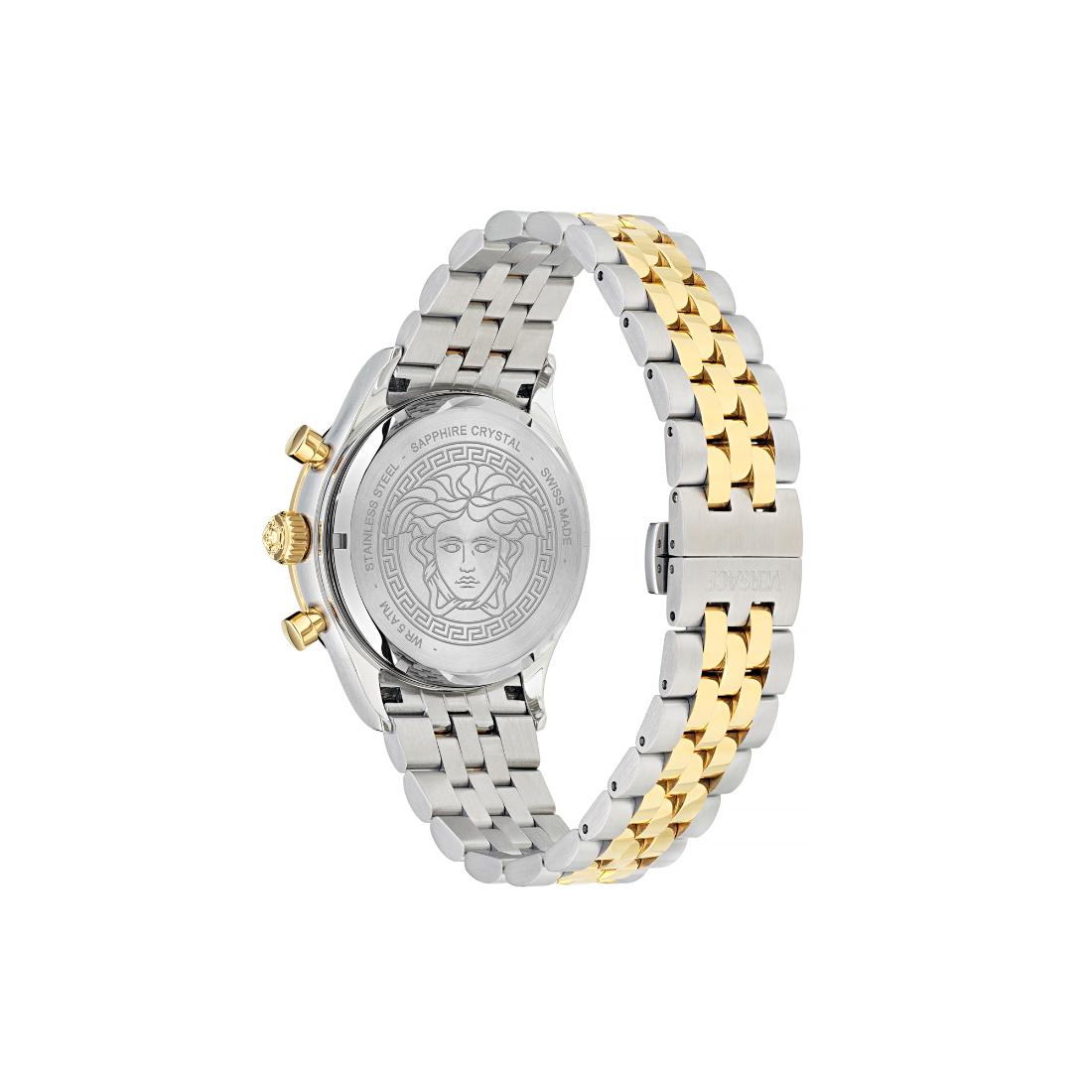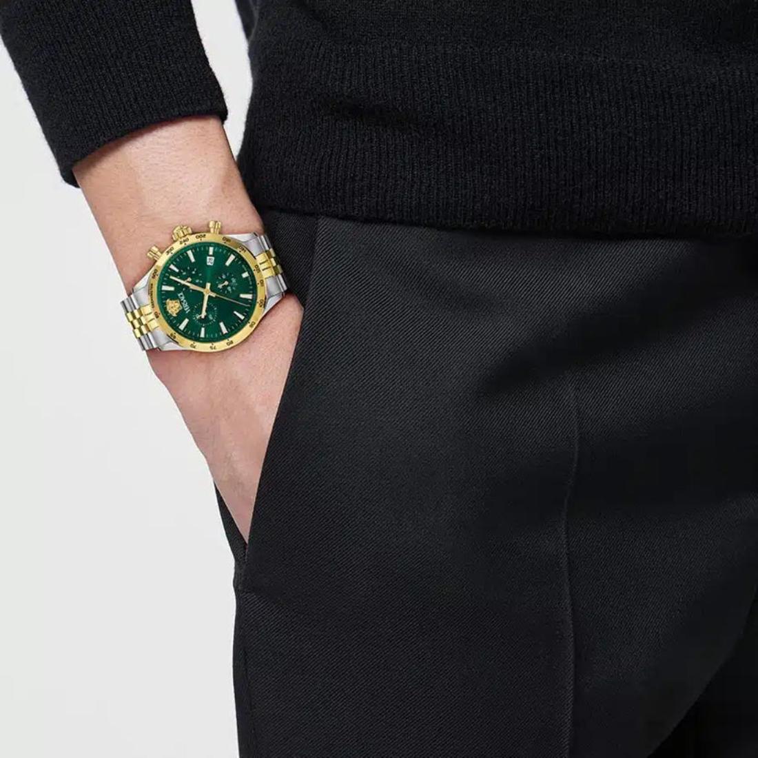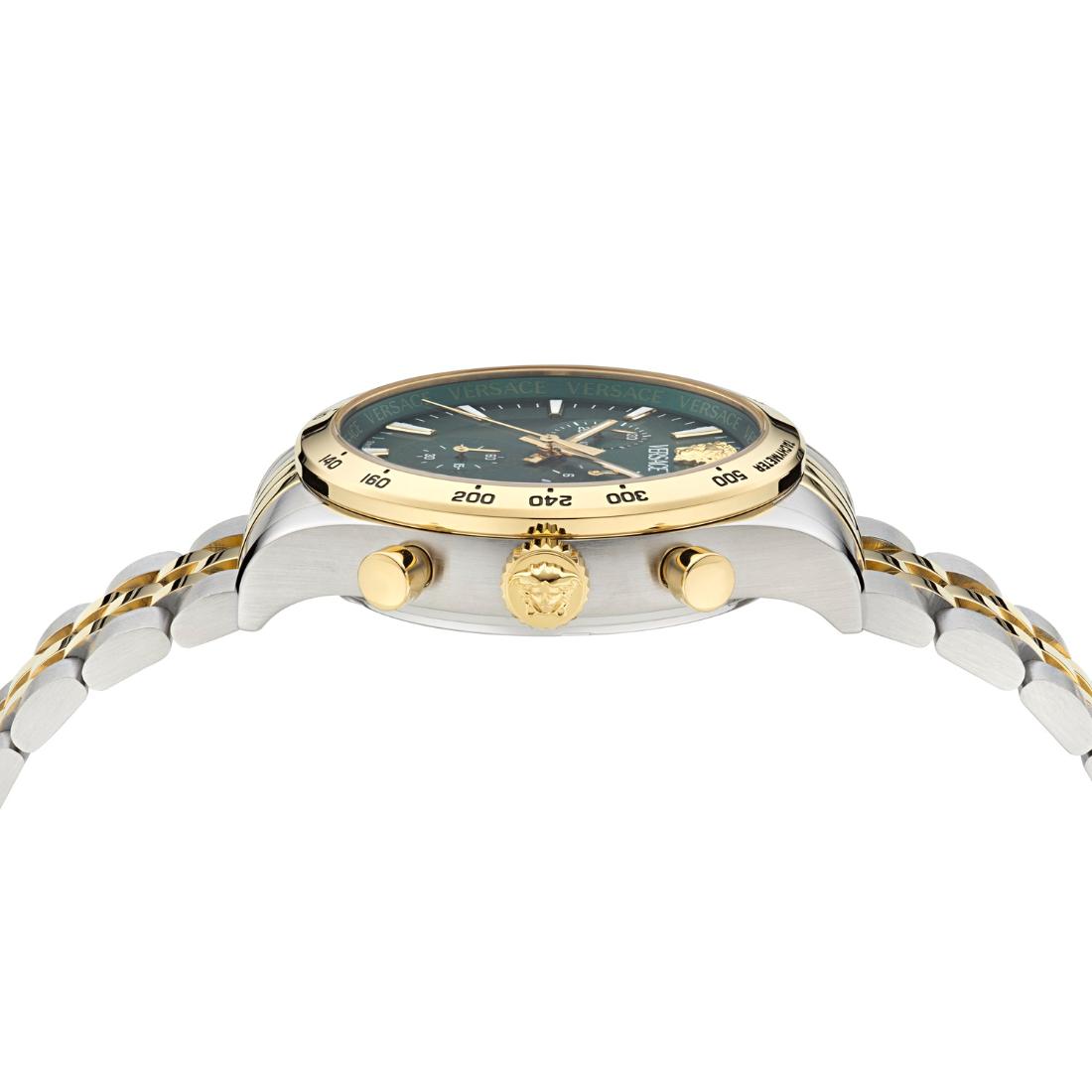 The Versace Helleny.Chr Petite Special features a distinctive green round dial with precise analog chronograph functions, designed for men who value a balance of style and technical excellence. Its compact yet impactful design offers reliable timekeeping and a unique aesthetic, ideal for those seeking a watch that combines elegance with performance.