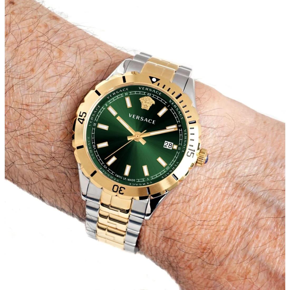 The Versace Hellenyium men's watch features a 42 mm case paired with an eye-catching green dial, expertly combining classic analog timekeeping with contemporary design. Built for accuracy and style, this timepiece exemplifies Versace’s dedication to sophisticated craftsmanship and refined aesthetics, perfect for the modern gentleman seeking a distinctive accessory.