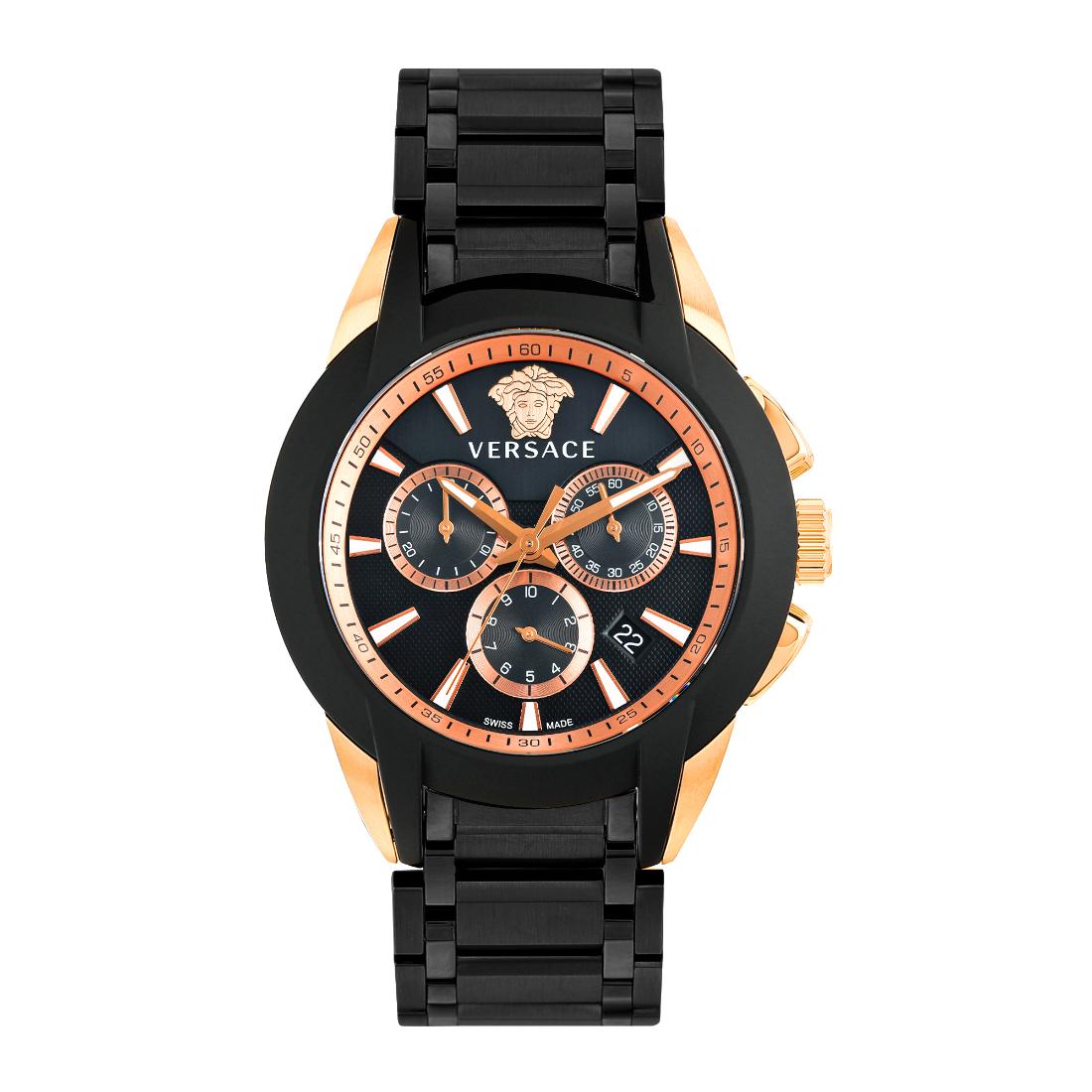 Expertly crafted by Versace, this stunning analog watch features a sleek 42 mm black round dial. The perfect combination of style and functionality, this watch will elevate any outfit. With its precise analog movement and contemporary design, this watch is a must-have for any fashion-forward man.