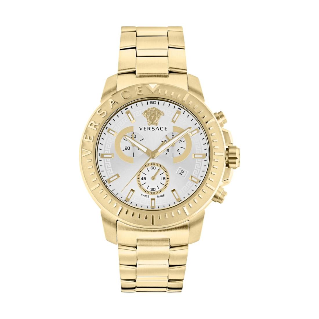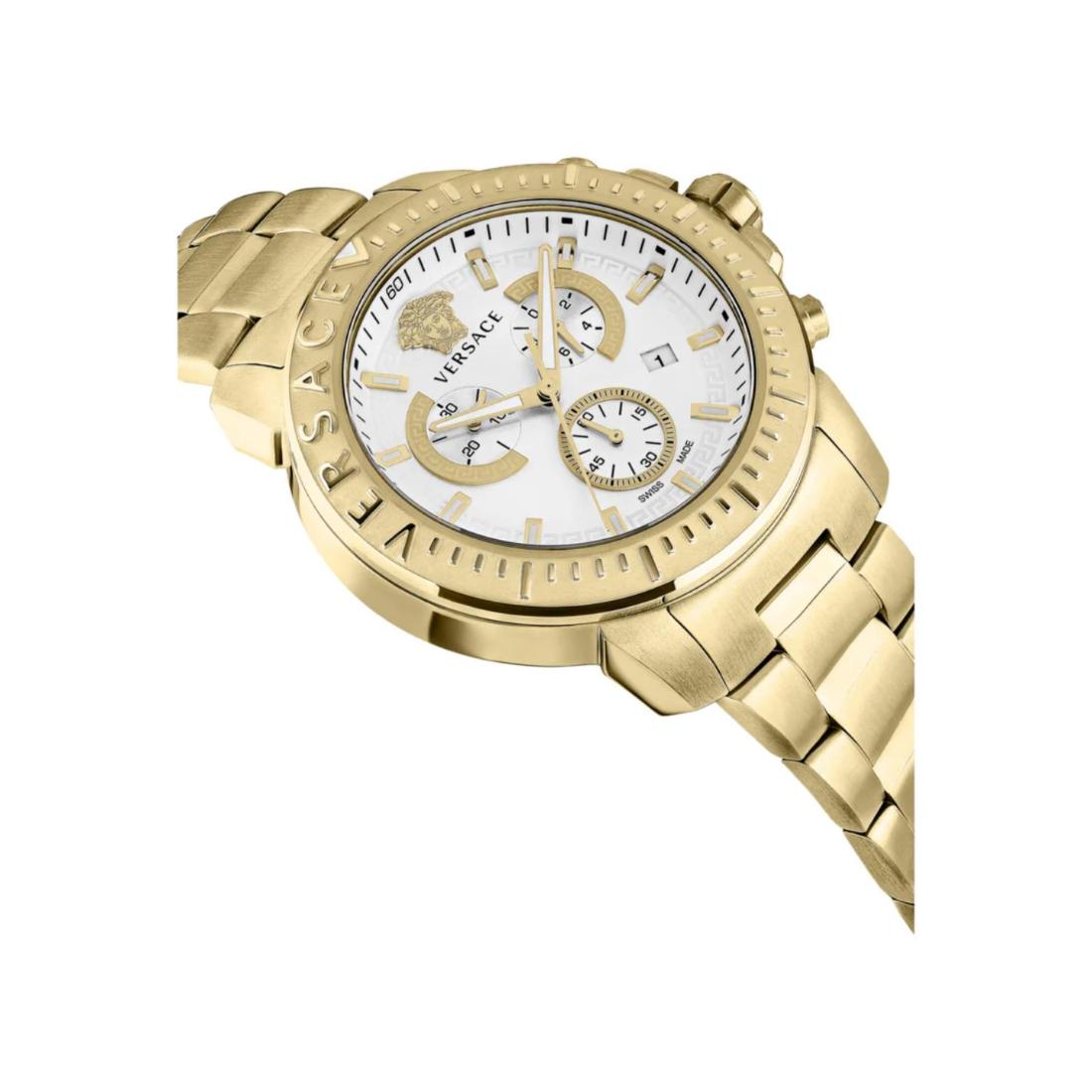 The Versace New Chrono men's watch features a 45 mm case complemented by a refined white-silver dial, combining precise chronograph functionality with elegant design. Crafted for accuracy and style, this timepiece reflects Versace’s commitment to luxury and performance, ideal for men who demand both sophistication and reliability.
