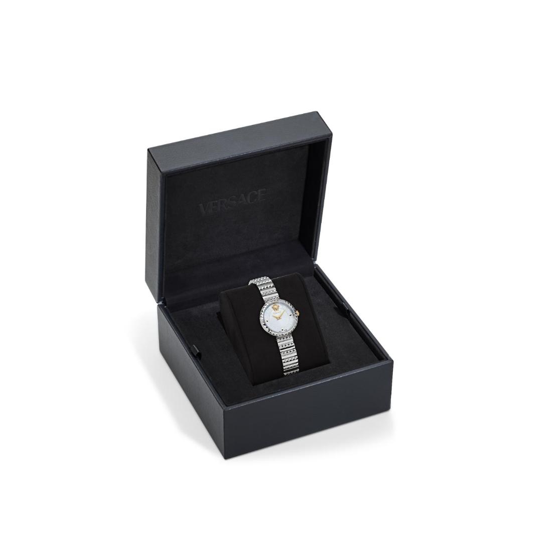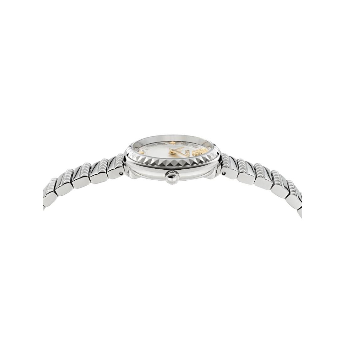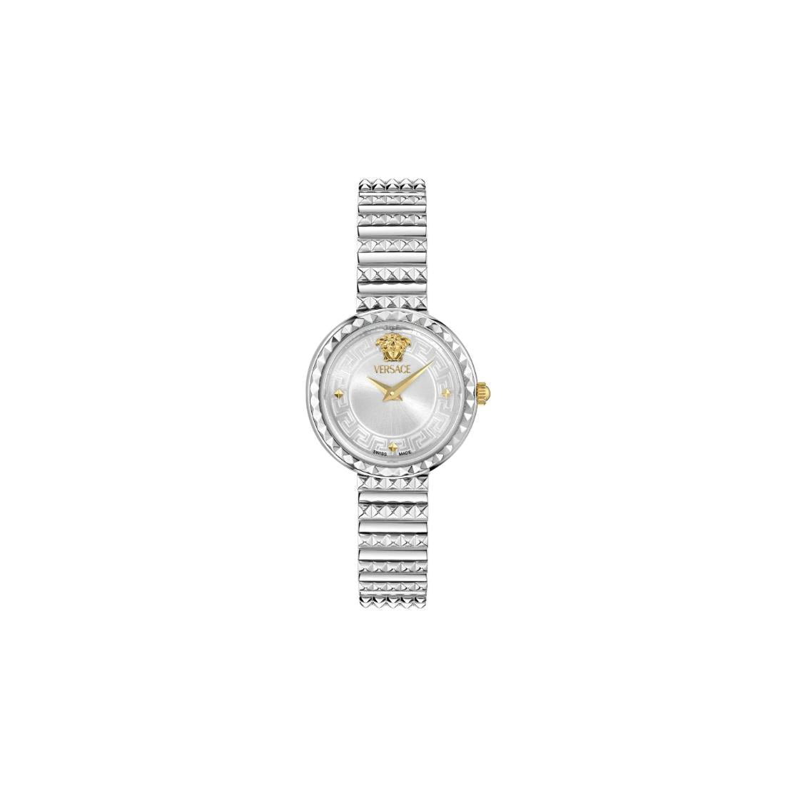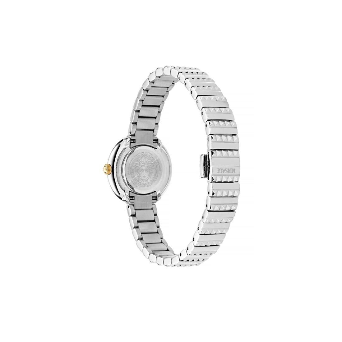 Introducing the Versace Newness 28mm Silver Dial Women's Analog Watch. With a sleek and classic design, this watch is perfect for any occasion. The 28mm size makes it a versatile accessory for any wrist. Stay stylish and punctual with this elegant timepiece.