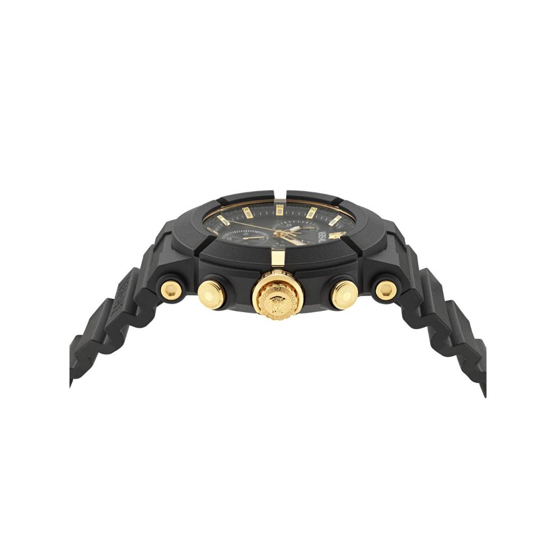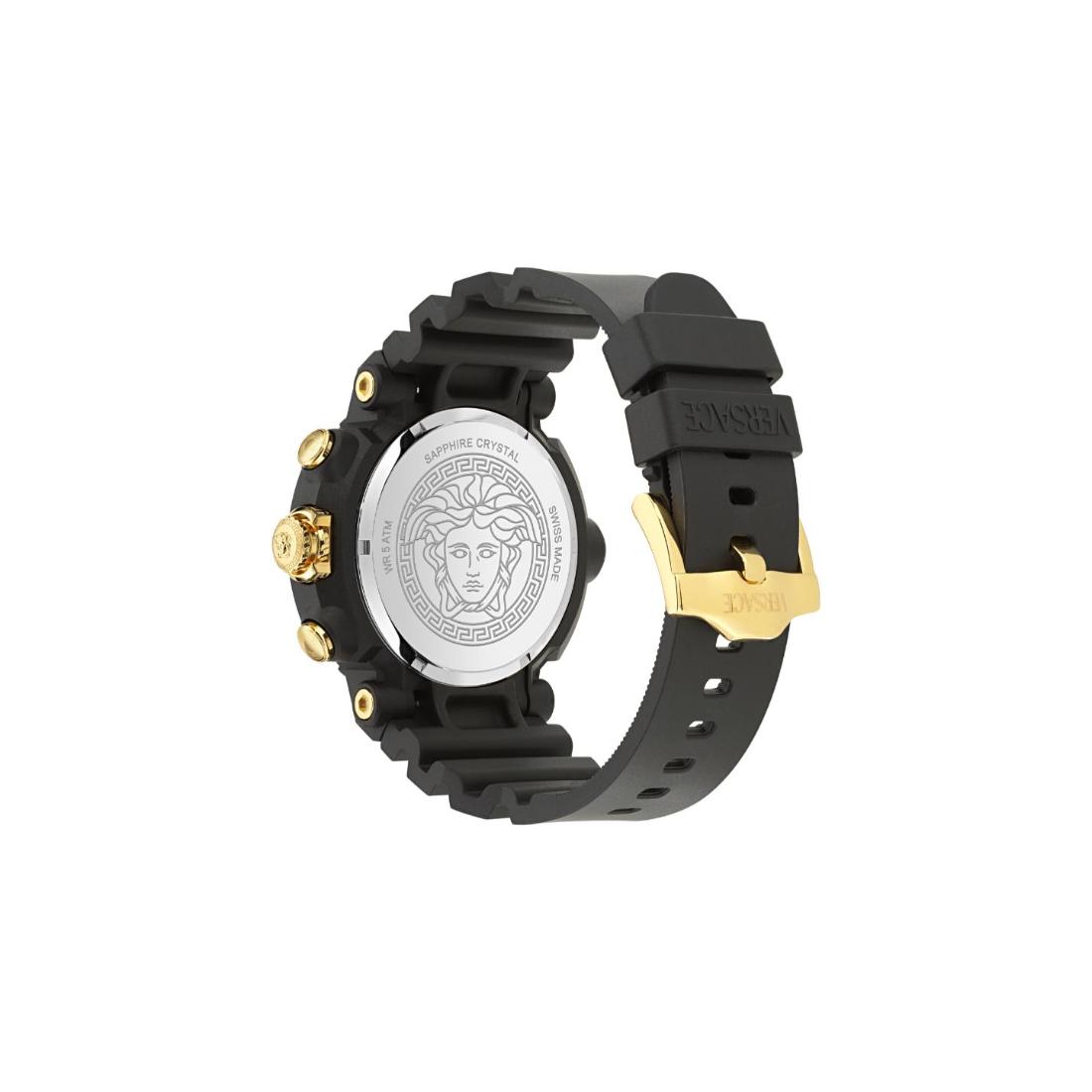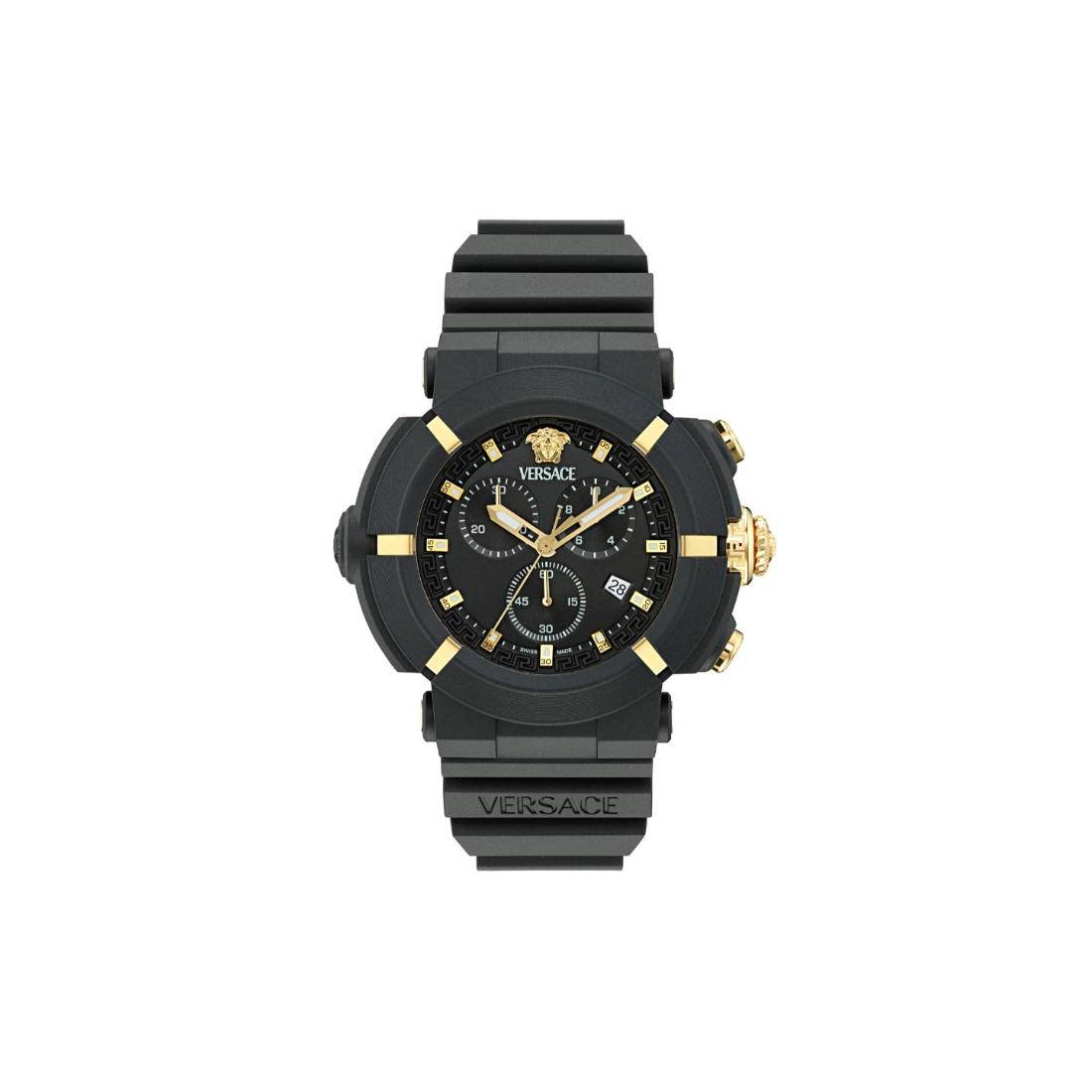 The Versace Real Active Chrono unisex watch features a 45 mm case with a sleek black dial, offering precise chronograph functionality in a versatile design. Combining robust performance with refined aesthetics, this timepiece is crafted to meet the demands of both style and accuracy for any wearer.