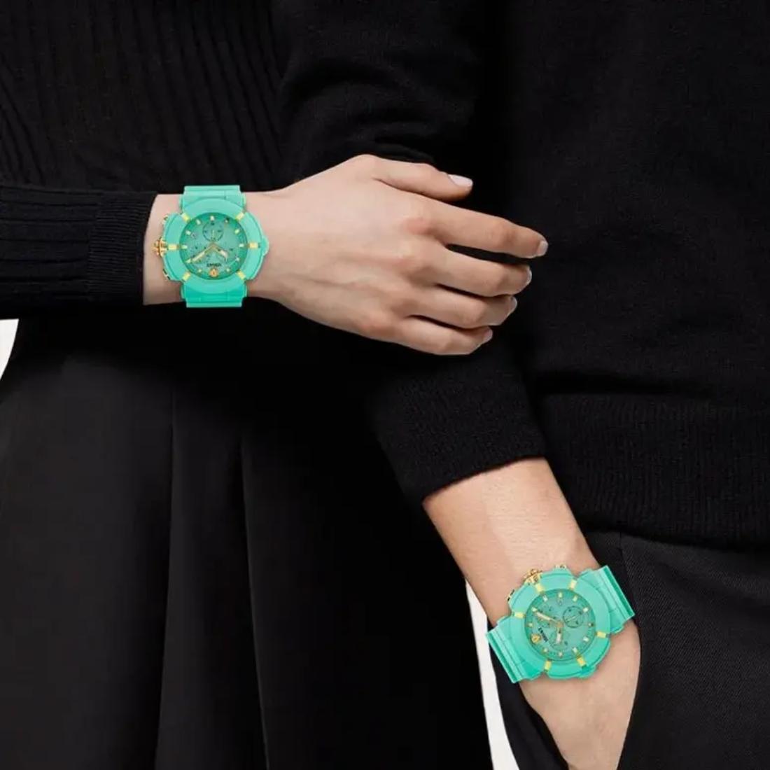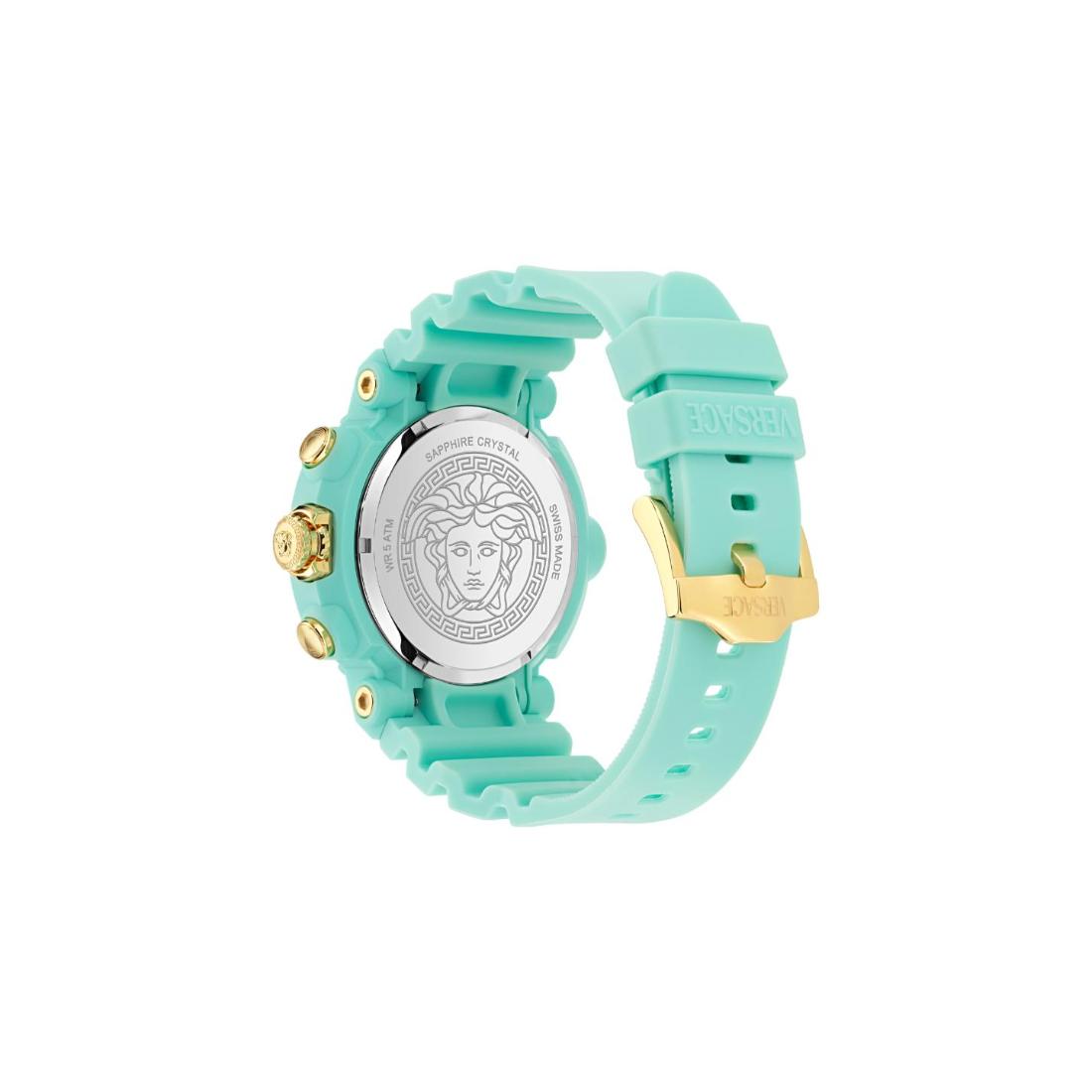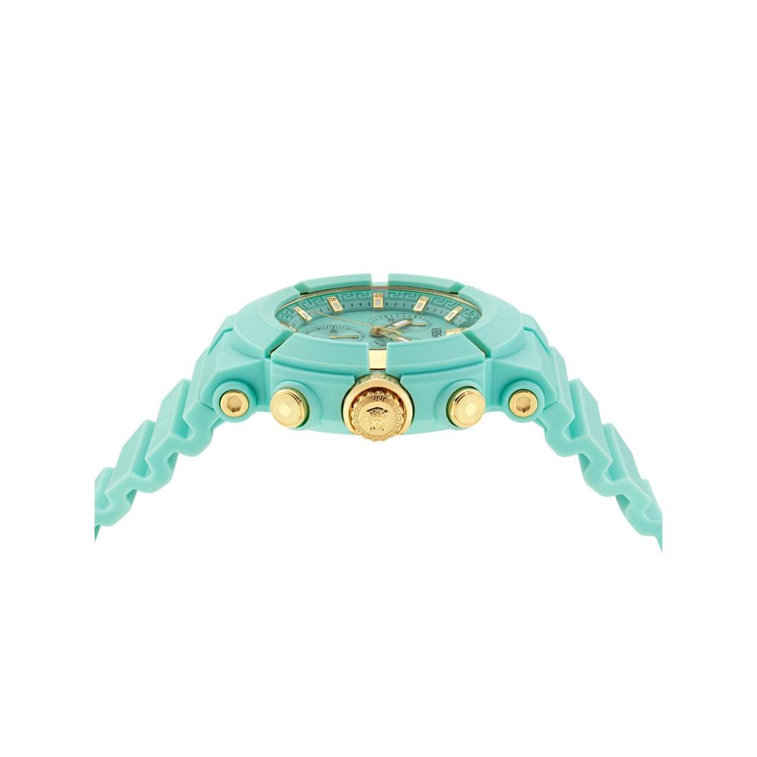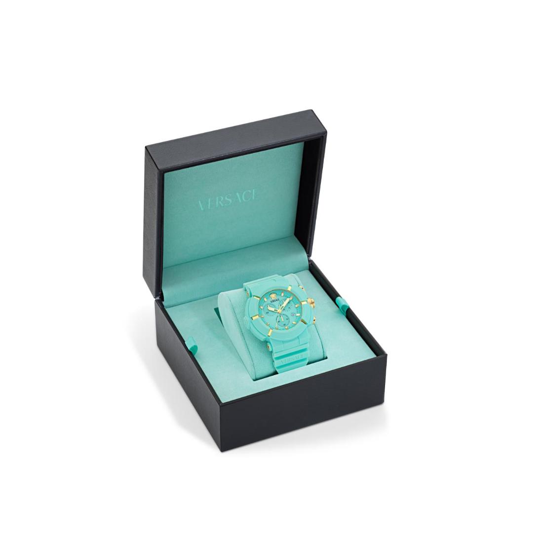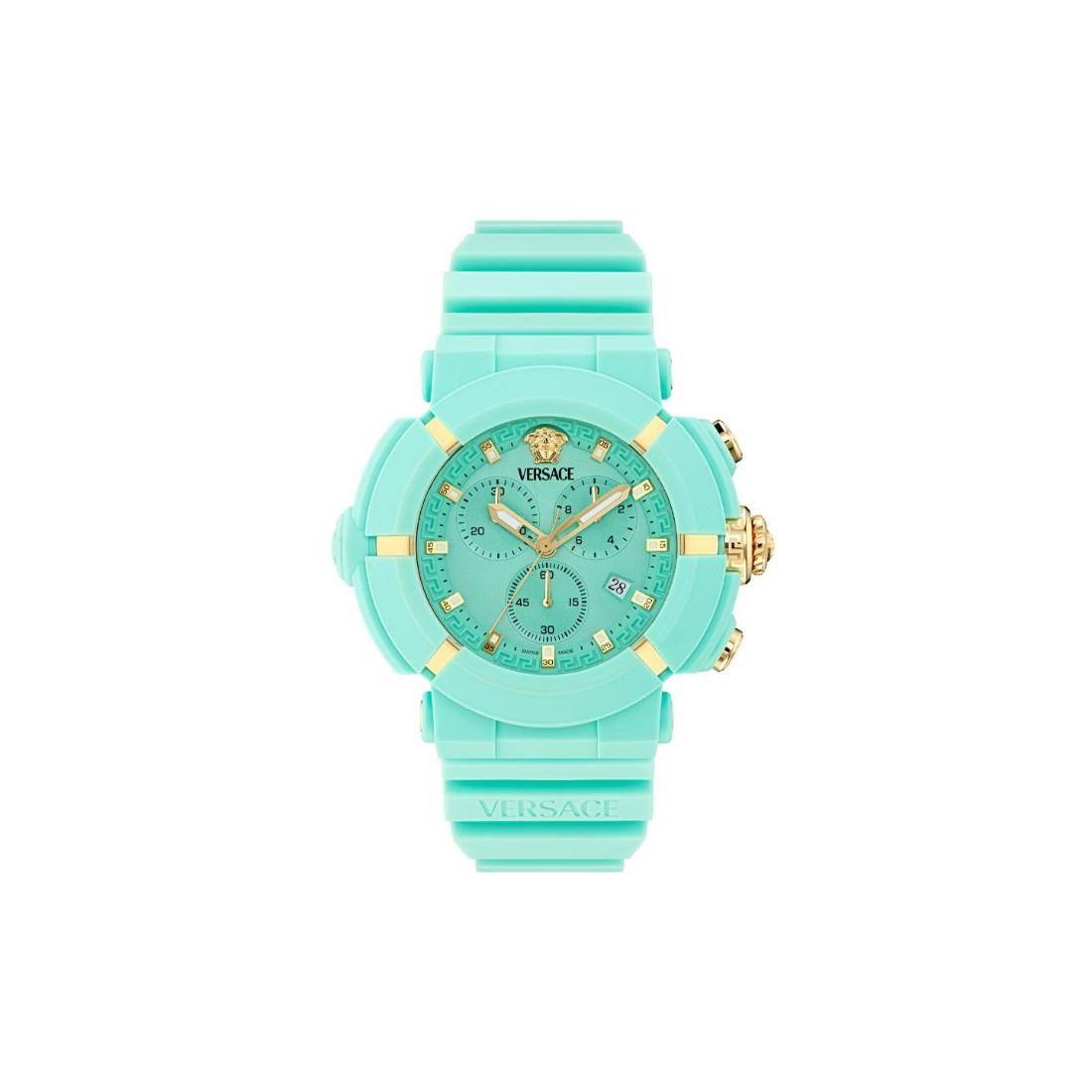 The Versace Real Active Chrono unisex watch features a 45 mm case complemented by a light blue dial, seamlessly blending precise chronograph functionality with contemporary elegance. Designed for both durability and refined style, this timepiece offers versatile performance suitable for any occasion.