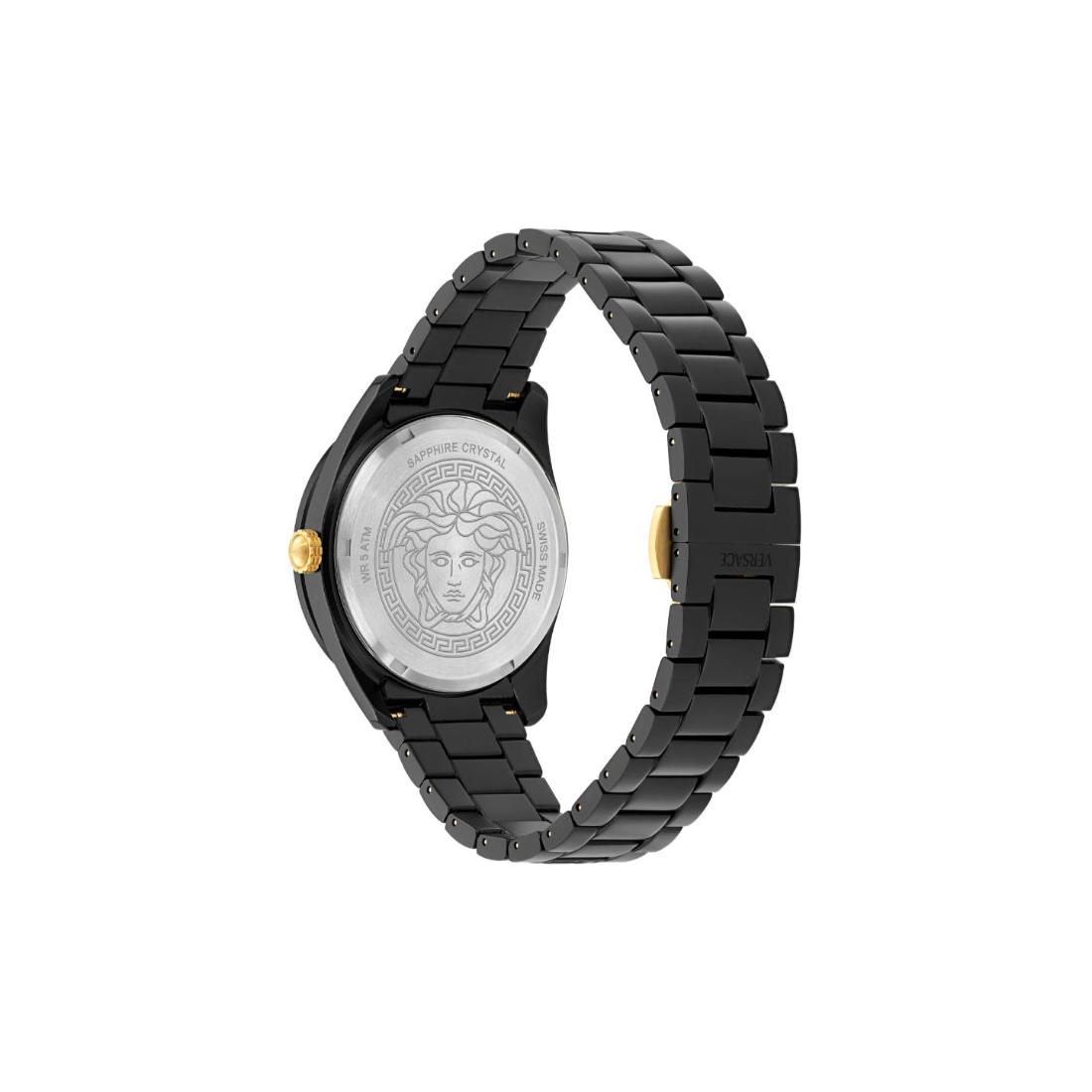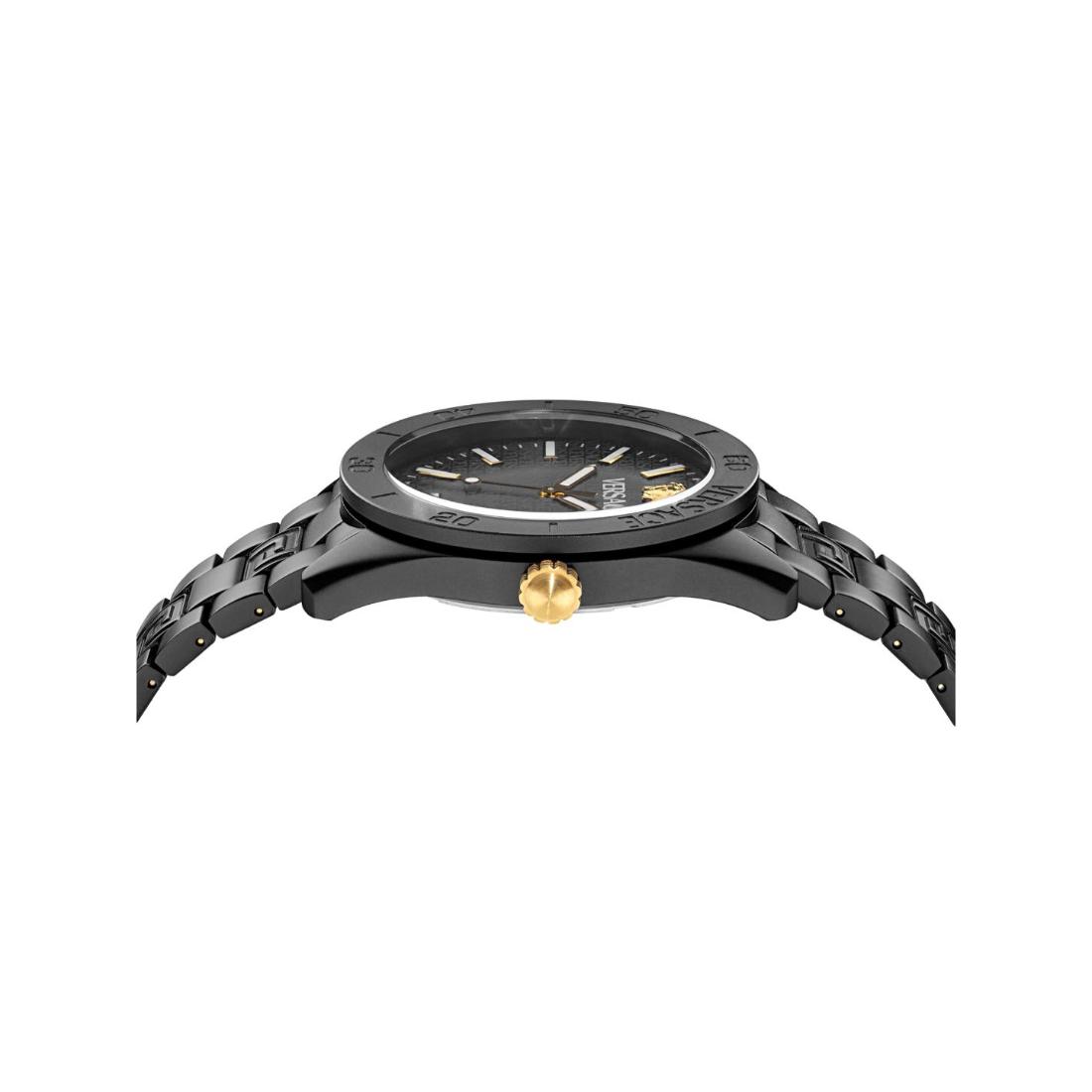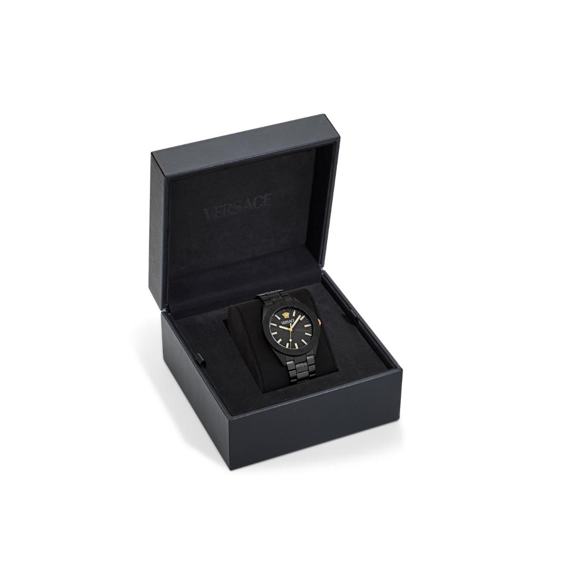 The Versace V-Dome men's watch features a commanding 42 mm case with a sleek black dial, blending precise analog timekeeping with refined design. This timepiece delivers reliable performance and timeless sophistication, embodying Versace’s dedication to luxury and modern elegance.