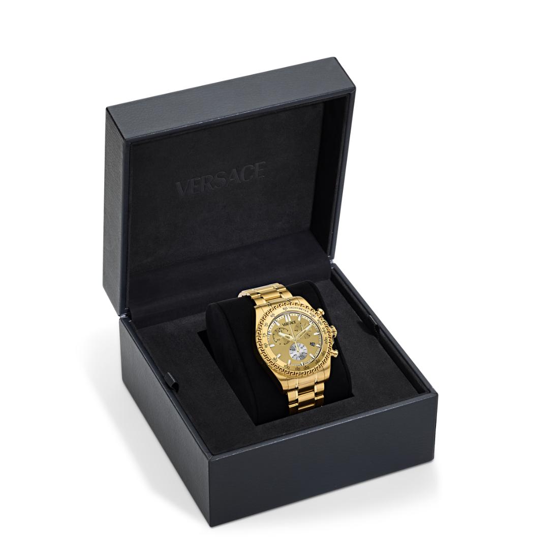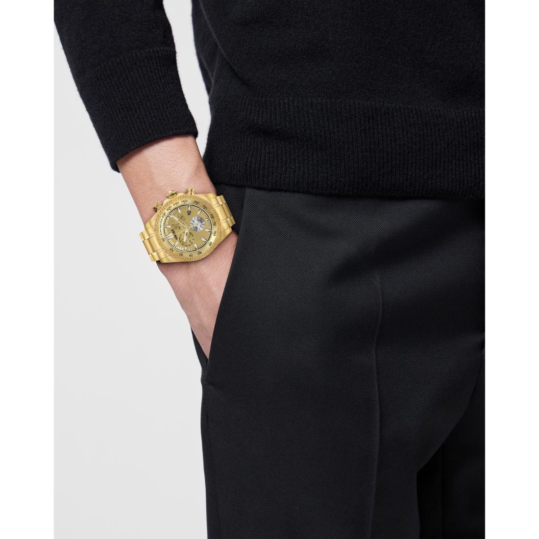 The Versace Chrono 44 mm features a luxurious gold dial with precise chronograph functionality, designed for men who appreciate a blend of classic elegance and advanced technical performance. Its substantial 44 mm case and refined craftsmanship deliver a sophisticated timepiece that elevates both professional and formal attire.