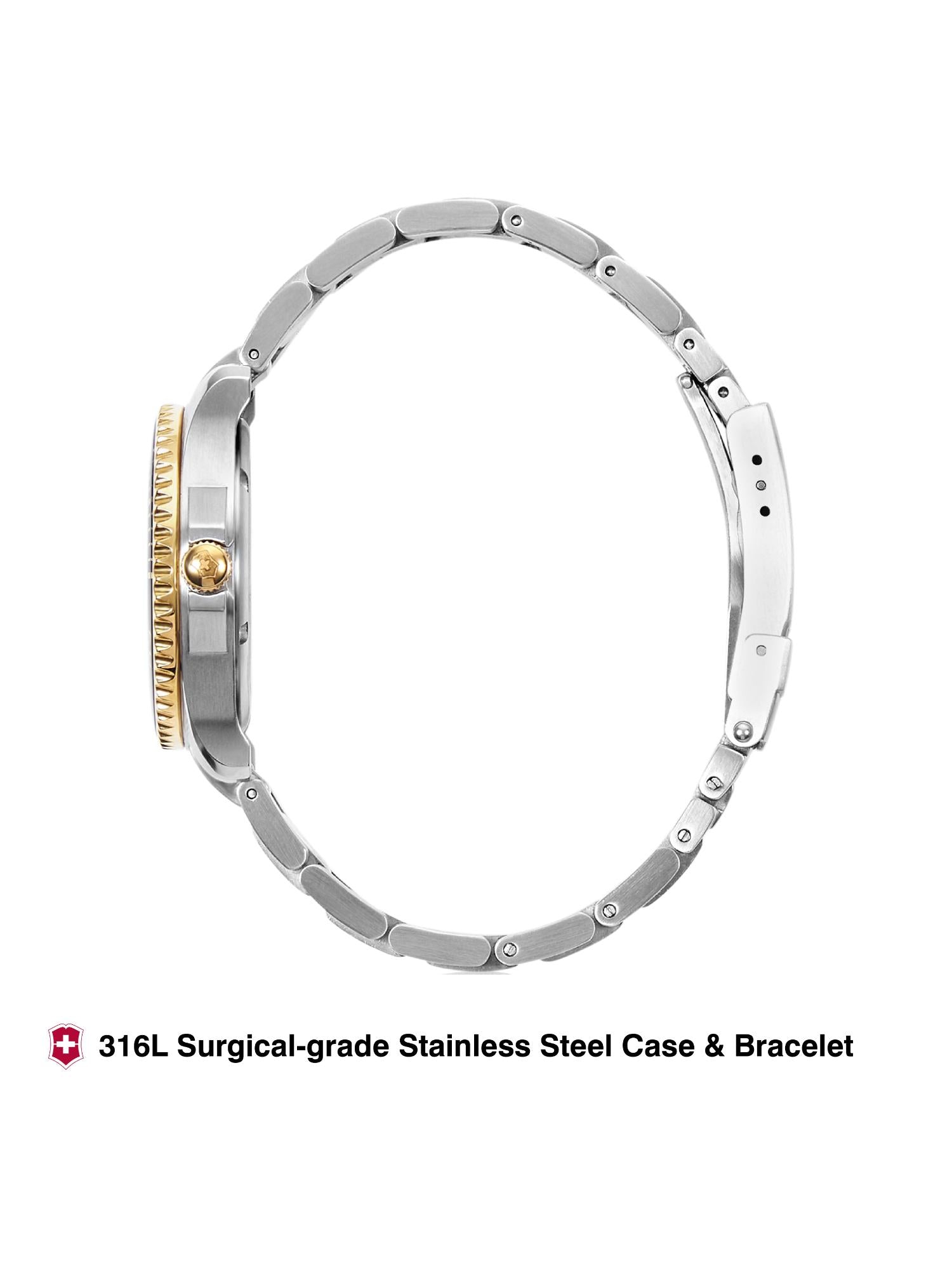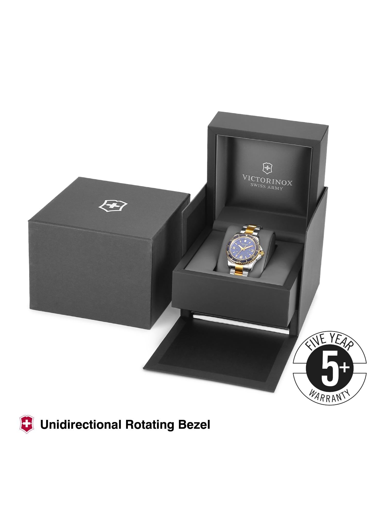 This Victorinox Maverick Watch (model V241790) features a 34 mm round blue dial with an analog display and a stainless steel strap closure. The battery-powered quartz movement is secured with a deployant clasp. The strap measures 18 mm in width and the dial is 9.5 mm in height. This watch comes with a 5-year warranty and includes a warranty card in the package.